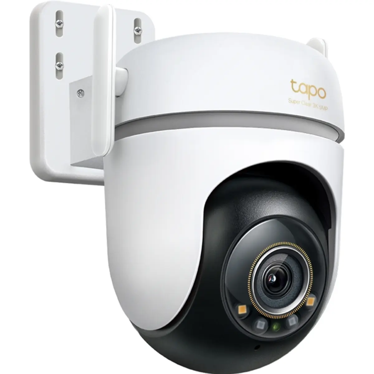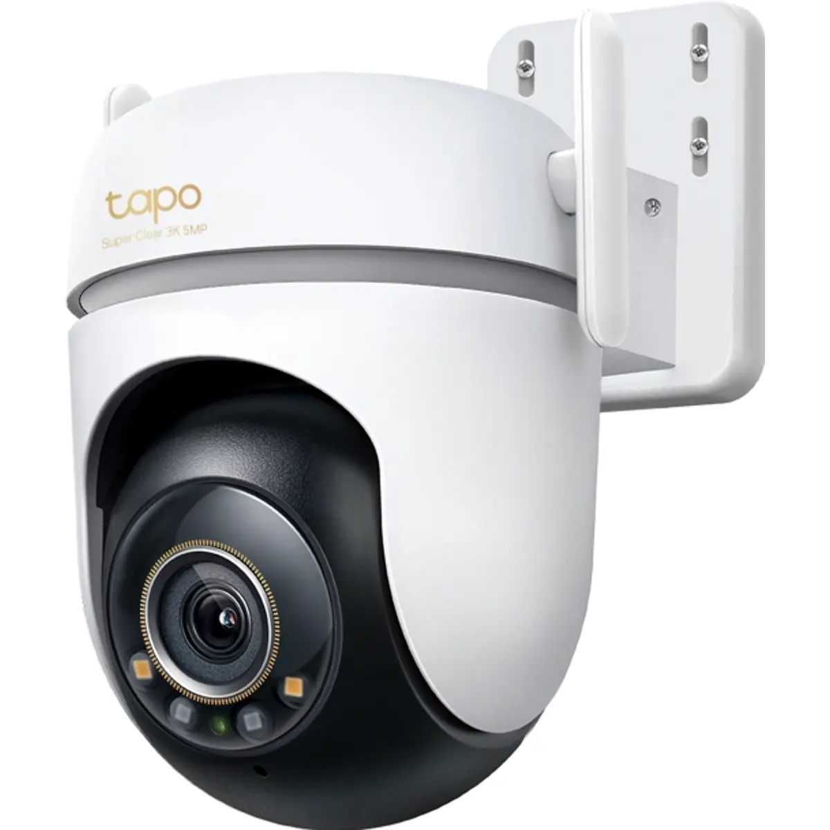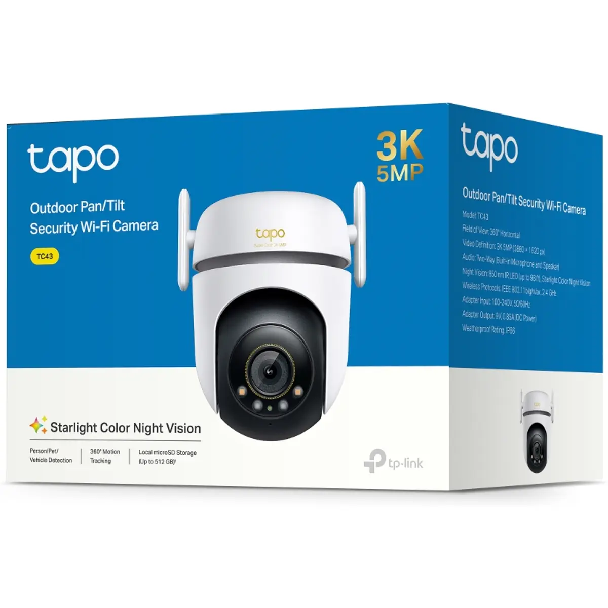 O Tapo TC43 é uma câmara de vigilância exterior com funcionalidade “pan/tilt”, que oferece visão 360° horizontal e 130° vertical, garantindo cobertura ampla sem ângulos mortos. Tem resolução 3K (5 MP) para visualização enriquecida, sistema de visão noturna a cores com sensor Starlight e luzes integradas, e classificação IP66 para resistência a pó e água. Pode ligar-se tanto via WiFi como por cabo Ethernet, suporta armazenamento local (microSD até 512 GB) e serviço de cloud opcional (Tapo Care) para gravação e acessos remotos.