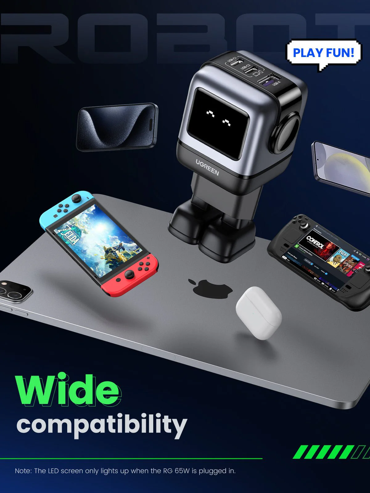 O UGREEN Nexode RG 65W é um carregador compacto mas potente, desenvolvido com tecnologia GaN (nitreto de gálio) para oferecer elevada eficiência num formato reduzido. Com três portas (2 USB-C e 1 USB-A) e distribuição inteligente de potência, permite carregar um portátil, smartphone e tablet simultaneamente, até até 65 W de saída total. O design inspirado num robô inclui um visor LED que exibe expressões faciais e status de carregamento, acrescentando um toque divertido e informativo ao dispositivo. Inclui suporte a múltiplos protocolos de carregamento rápido (como PD, PPS, QC, etc.), garantindo compatibilidade com uma vasta gama de dispositivos modernos. É uma excelente opção para quem valoriza mobilidade, desempenho e economia de espaço, sem comprometer a potência ou a versatilidade.