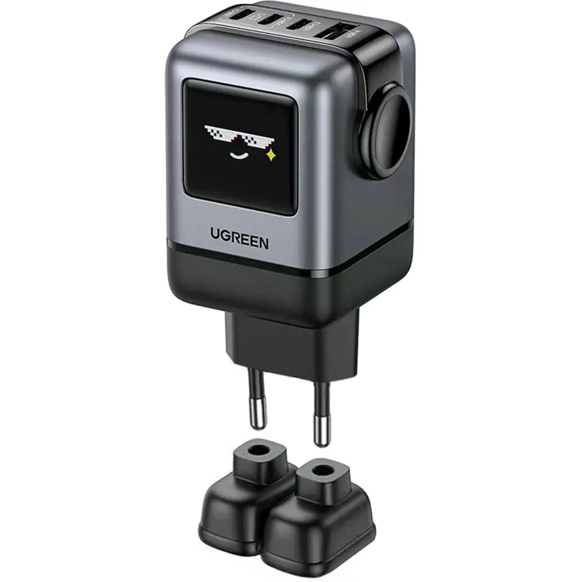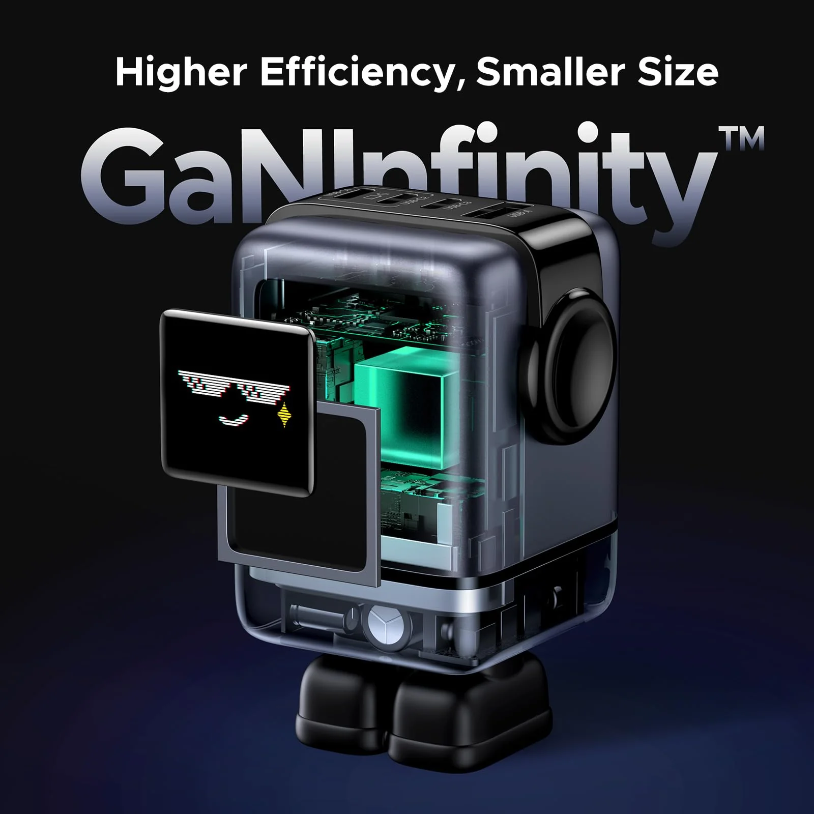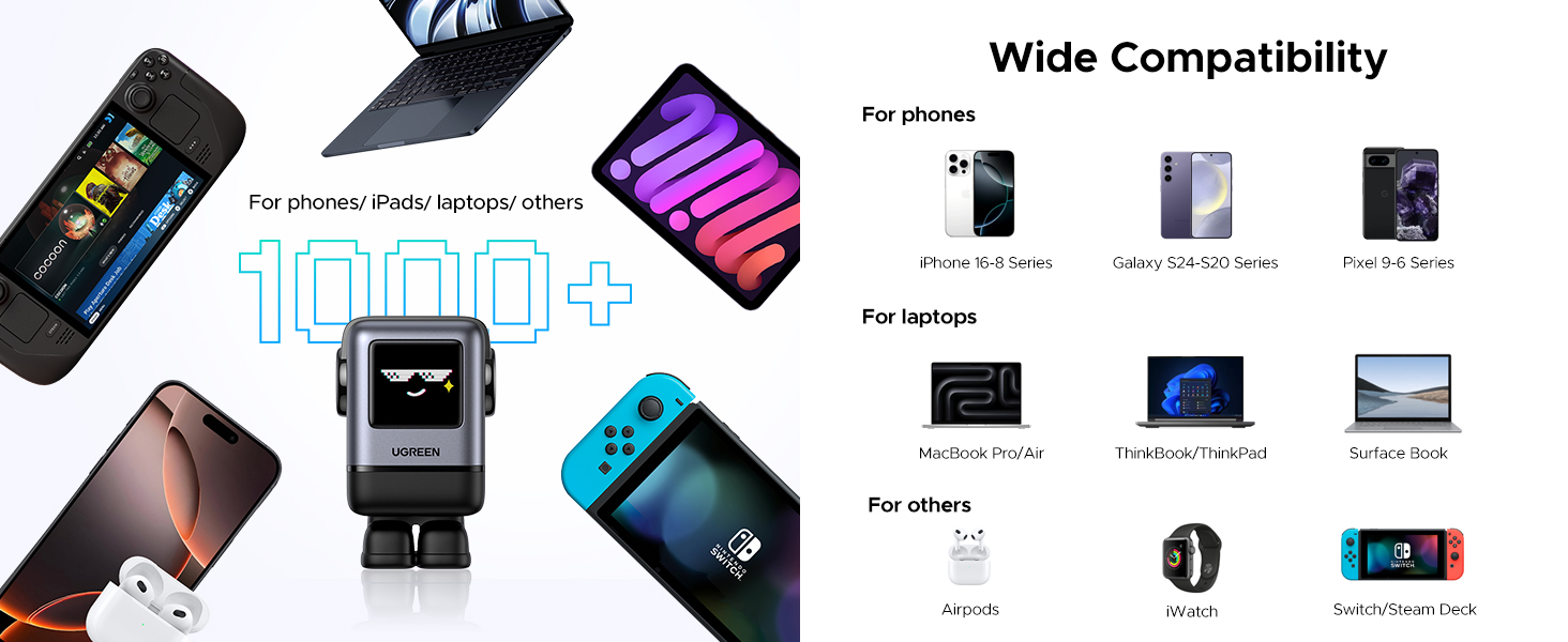 O UGREEN Nexode RG 100W combina tecnologia de carregamento rápido GaN com um design inovador e divertido em forma de robô. Projetado para oferecer potência, eficiência e um toque de originalidade, este carregador é ideal para quem procura desempenho máximo aliado a uma estética moderna. O ecrã TFT animado exibe expressões diferentes consoante o estado de carregamento, tornando cada utilização mais interativa e visualmente apelativa. Os “pés” magnéticos permitem fixá-lo facilmente ao portátil, para manter o UGREEN Uno sempre à mão. O carregamento rápido de 100W, com tecnologia GaN de alta eficiência, permite carregar um MacBook Pro 16” até 43% em apenas 30 minutos ou um iPhone 15 até 55%, via USB-C, com os dois ligados ao mesmo tempo. Oferece carregamento simultâneo de 4 dispositivos, com 3 portas USB-C e 1 porta USB-A, fornecendo energia rápida e estável para portáteis, smartphones, tablets e outros dispositivos. Este pequeno robô Uno de 100W está munido de 8 níveis de proteção: inclui chip PWM e chip de retificação síncrona para máxima eficiência energética, com proteção contra sobretensão, sobrecorrente, sobrecarga, curto-circuito, sobreaquecimento e outros riscos elétricos. É compatível com uma ampla gama de dispositivos, incluindo iPhone 8–16, Samsung Galaxy S10–S24, Google Pixel 6–8, MacBook Air/Pro, iPad Pro/Air/mini, Apple Watch, AirPods Pro, HomePod e muitos mais.
