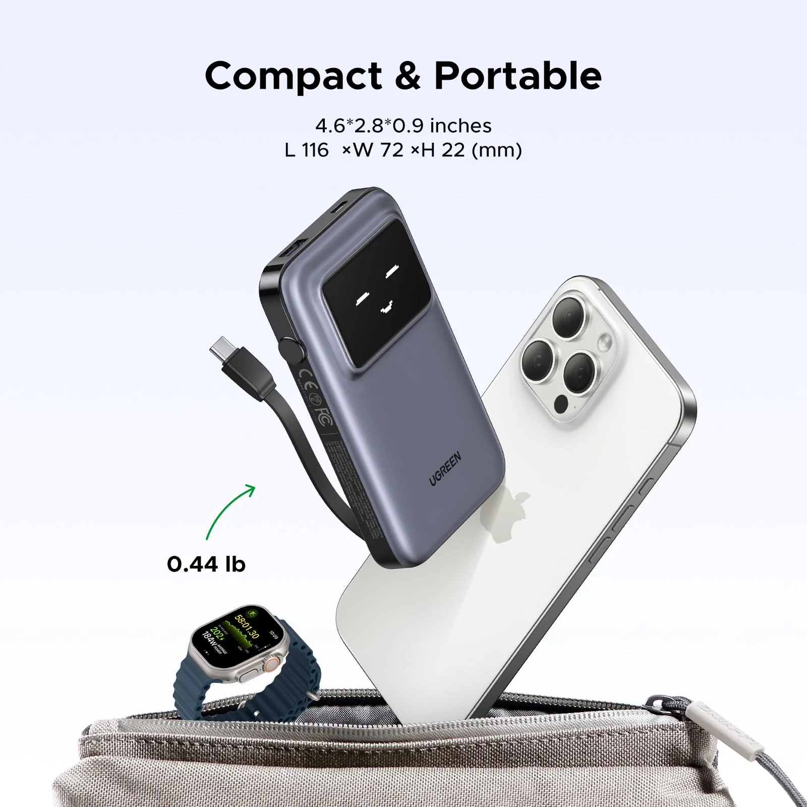 O Power Bank UGREEN 10.000mAh QC 30W é uma solução de carregamento portátil elegante, compacta e extremamente eficiente, ideal para quem precisa de energia rápida em qualquer lugar. Com carregamento bidirecional de 30W, cabo USB-C integrado e visor digital TFT, este power bank combina potência, conveniência e tecnologia avançada num único equipamento. Graças ao seu design, com estrutura fina e leve, pode ser transportado facilmente no bolso ou mochila, enquanto a bateria de 10.000mAh garante energia suficiente para várias cargas completas do smartphone. Além disso, a compatibilidade alargada com dispositivos iOS, Android e tablets torna-o um acessório versátil para o dia a dia.