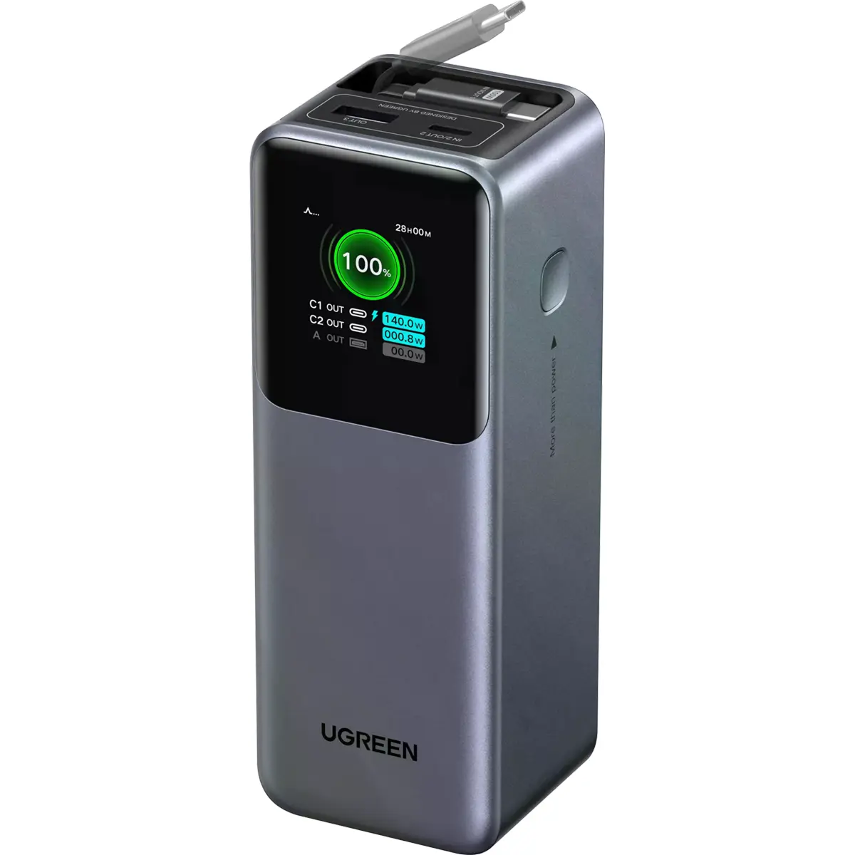 Com uma potência máxima combinada de 165 W, duas portas USB-C e uma USB-A, consegue carregar simultaneamente vários dispositivos com alta velocidade, incluindo laptops compatíveis com USB-C PD (Power Delivery), smartphones e outros gadgets. A integração de um painel TFT permite visualizar informações em tempo real sobre a carga restante ou a potência de saída, tornando o uso mais intuitivo e transparente.