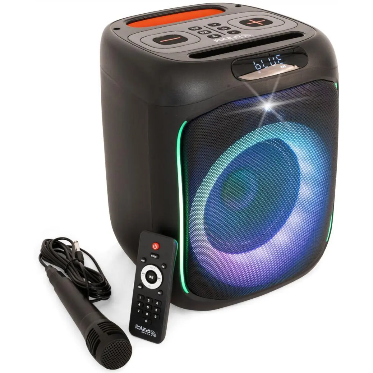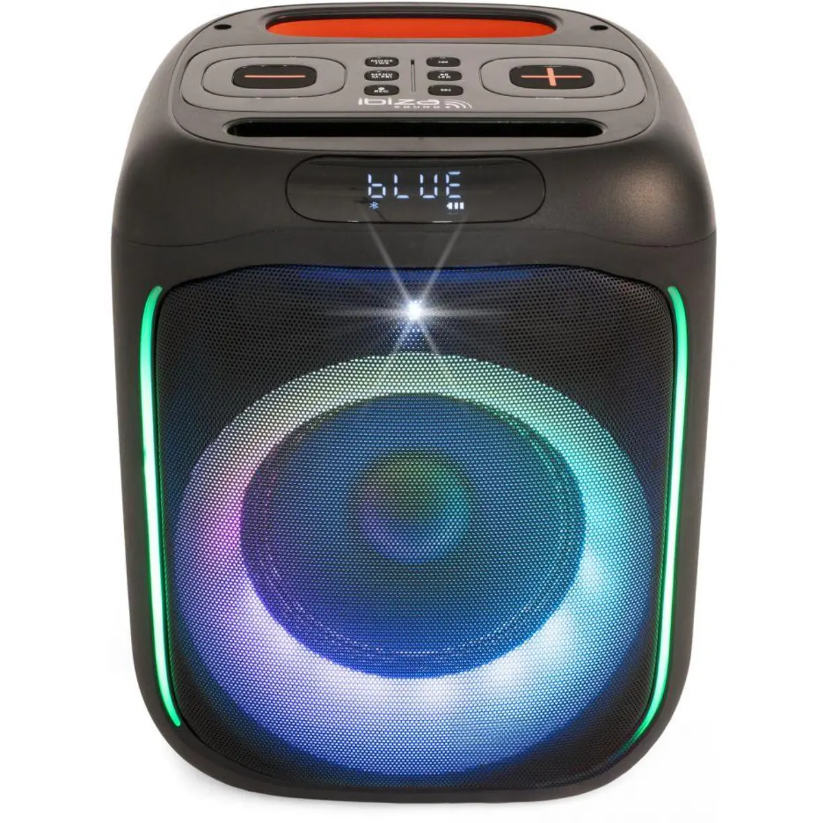A Ibiza CUBE180 é uma coluna portátil leve e compacta, ideal para festas, eventos e utilização em movimento. Equipada com woofer de 6,5", luzes LED e bateria recarregável, permite reproduzir música via Bluetooth, USB, cartão Micro SD ou rádio FM. O design inclui uma pega para transporte fácil e um suporte prático para telemóveis ou tablets. É ainda possível emparelhar duas unidades CUBE180 para som estéreo sem fios (TWS).