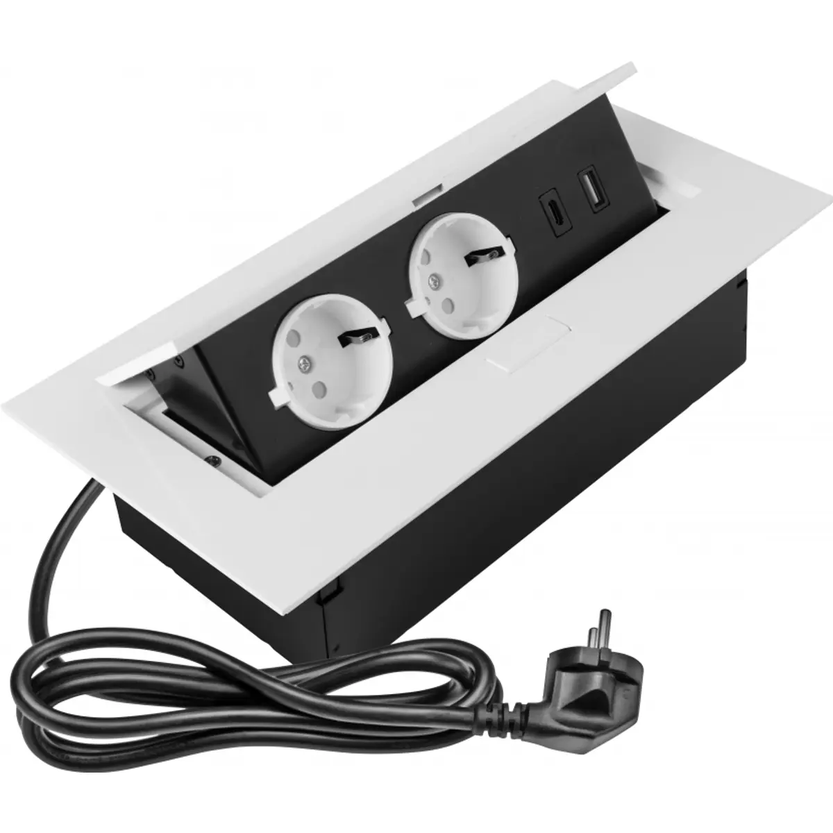 GTV Lighting - Bloco de tomadas de encastrar com tampa 2x Schuko + USB-A + USB-C – cabo 1.5m – Branco