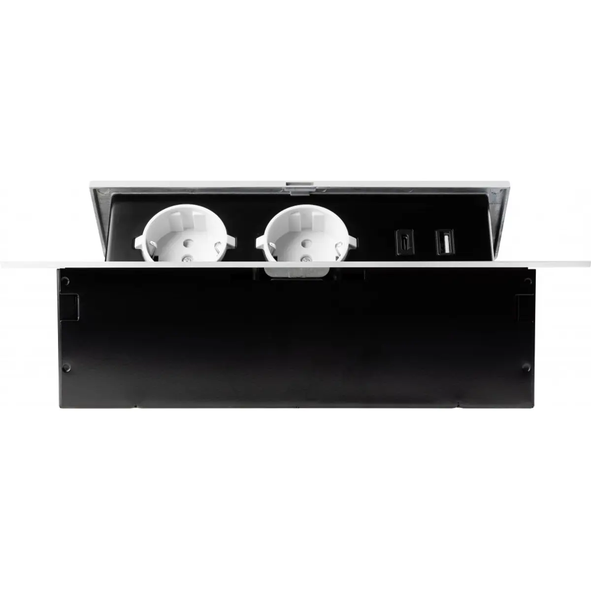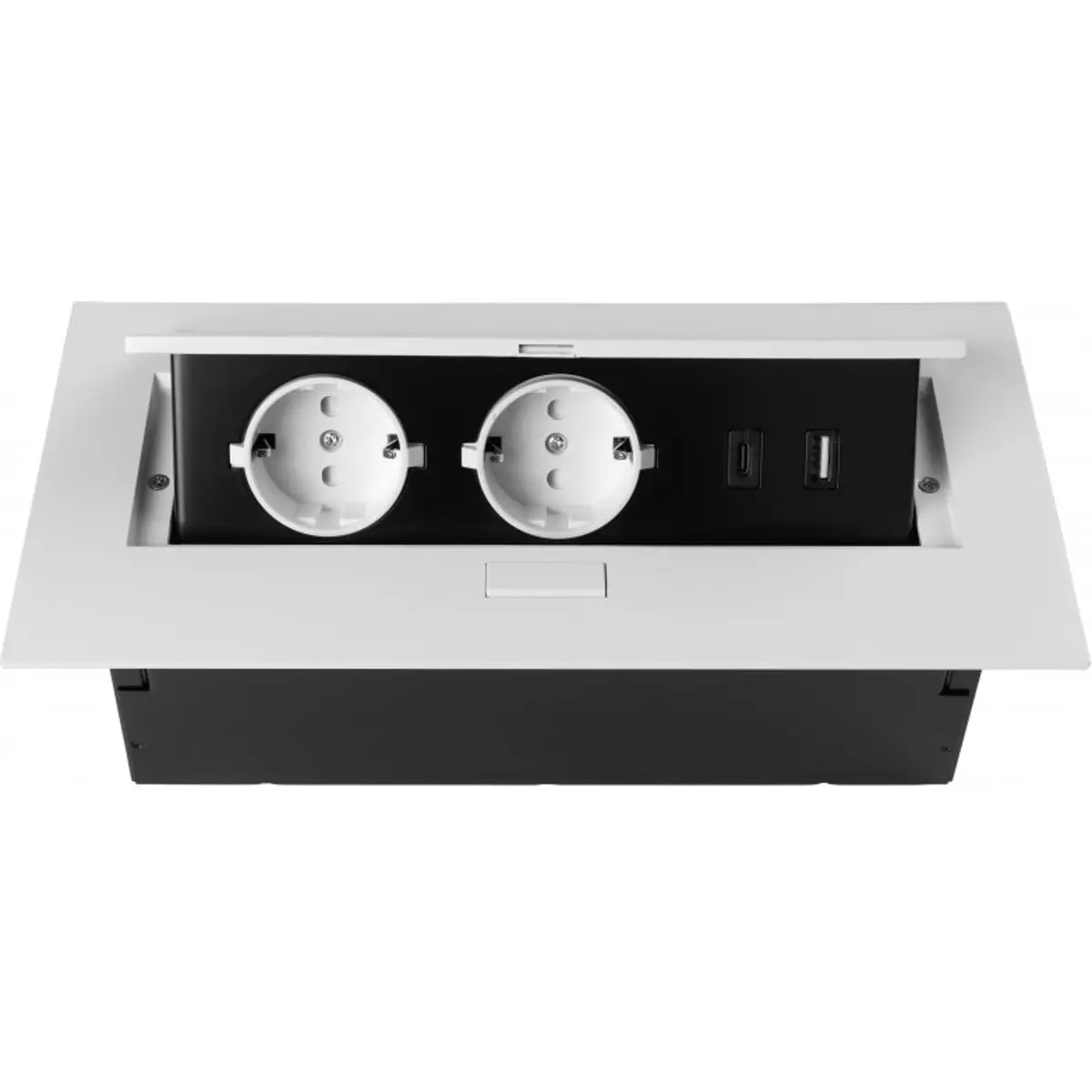 Inclui duas tomadas Schuko e duas portas USB (A e C) para carregamento a 5V/2A. Após a utilização, o módulo pode ser recolhido para dentro da superfície, mantendo o espaço organizado.