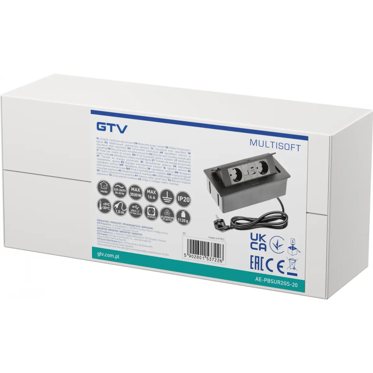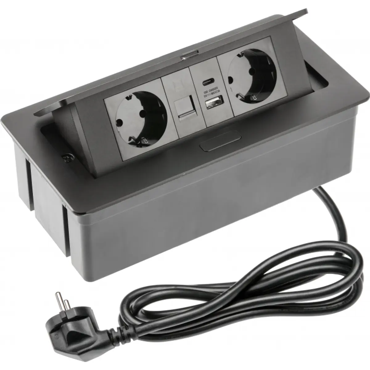 GTV Lighting MULTISOFT - Bloco de tomadas de encastrar com tampa 2x Schuko + USB-A + USB-C + RJ45 – cabo 1.5m – Preto
