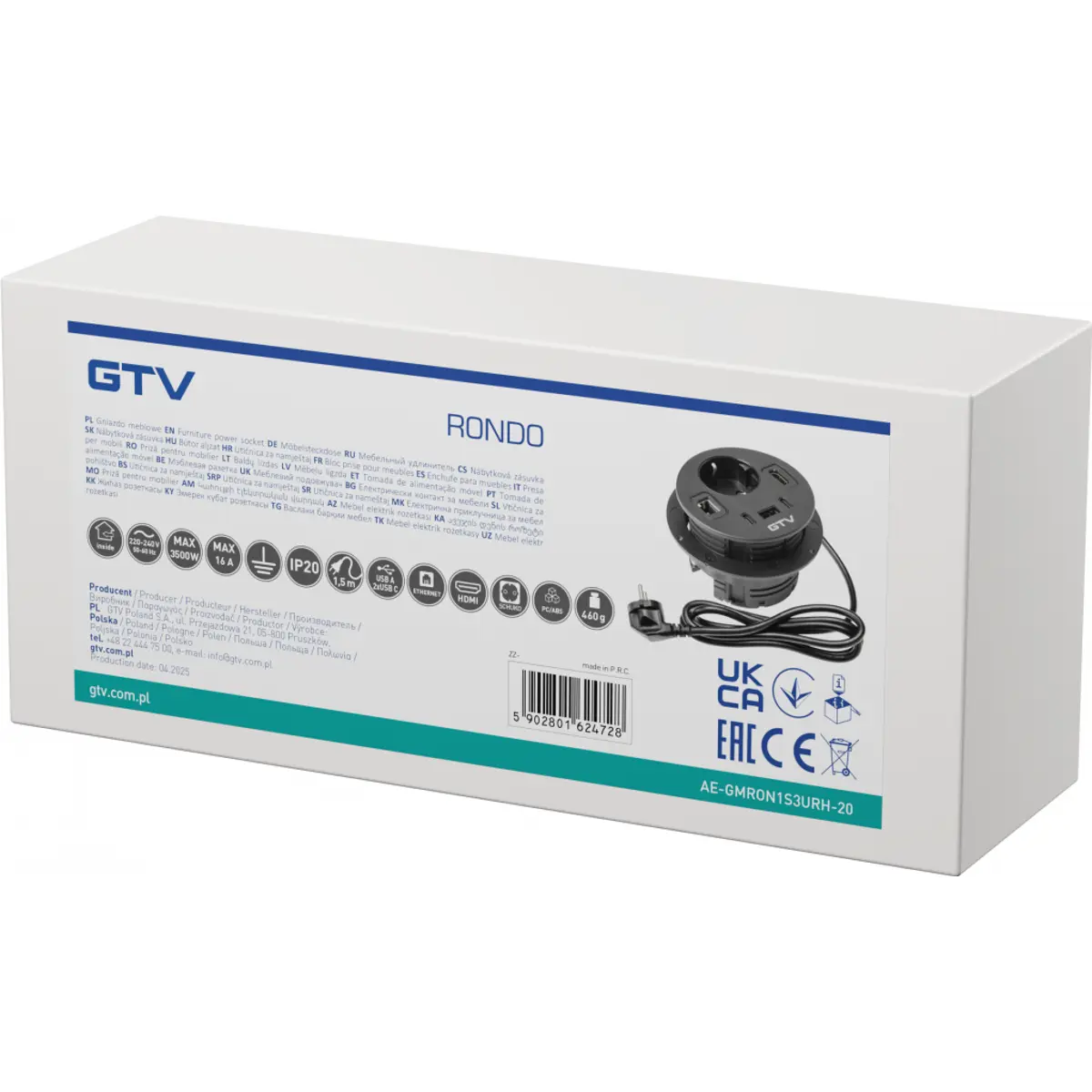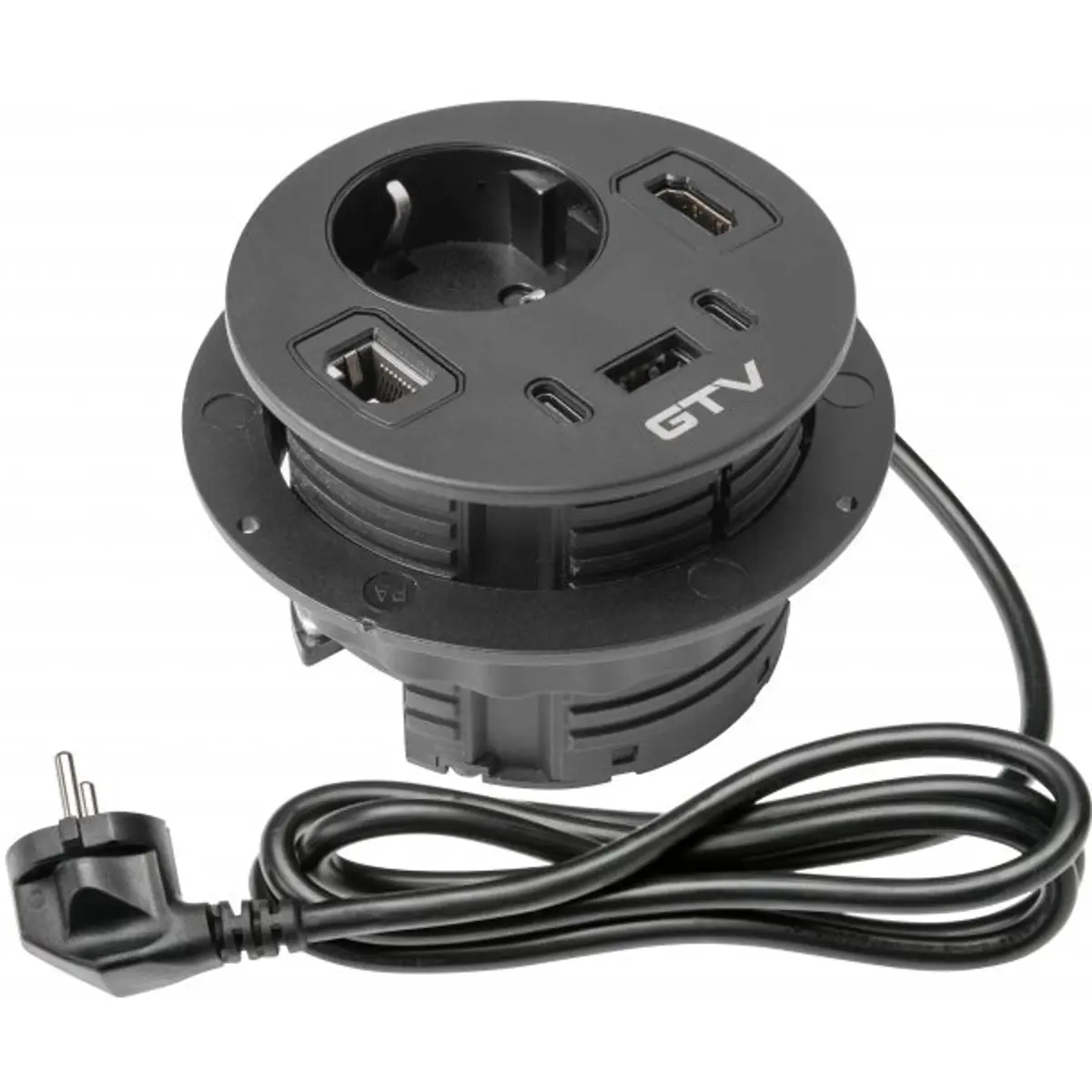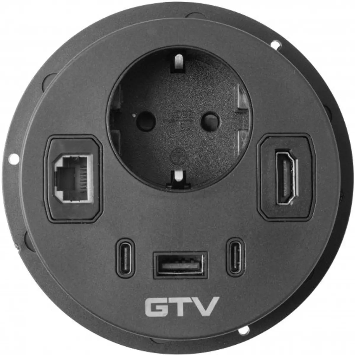 GTV Lighting RONDO - Bloco de tomadas de encastrar (Ø80mm) 1x Schuko + USB-A + 2x USB-C PD + HDMI + RJ45 - Preto