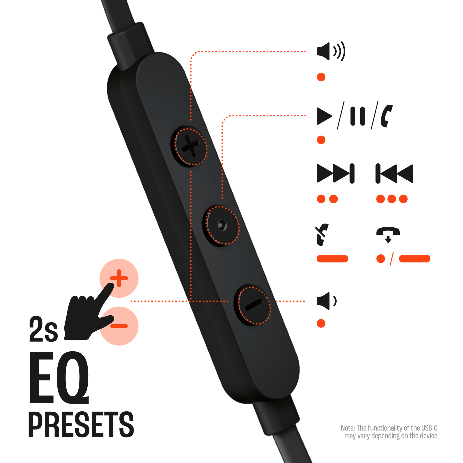 A ligação USB-C direta é compatível com uma ampla gama de dispositivos modernos (smartphones, tablets, PCs e consolas portáteis) que suportam áudio por USB-C. O sistema de controlo de três botões integrado no cabo anti-enleio permite gerir reprodução, volume e chamadas sem retirar o dispositivo do bolso. O auricular inclui ainda microfone para chamadas em modo mãos-livres com clareza e três tamanhos de ponteiras auriculares para conforto personalizado.