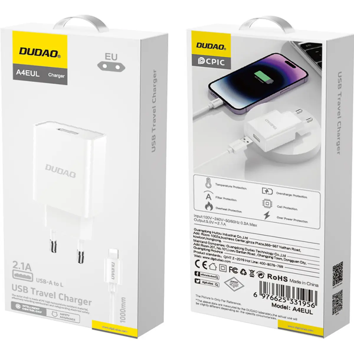 Carregador compacto e seguro, ideal para casa ou viagem. Permite carregamento rápido de dispositivos com corrente de 2.1A e é fabricado com materiais resistentes ao fogo.
