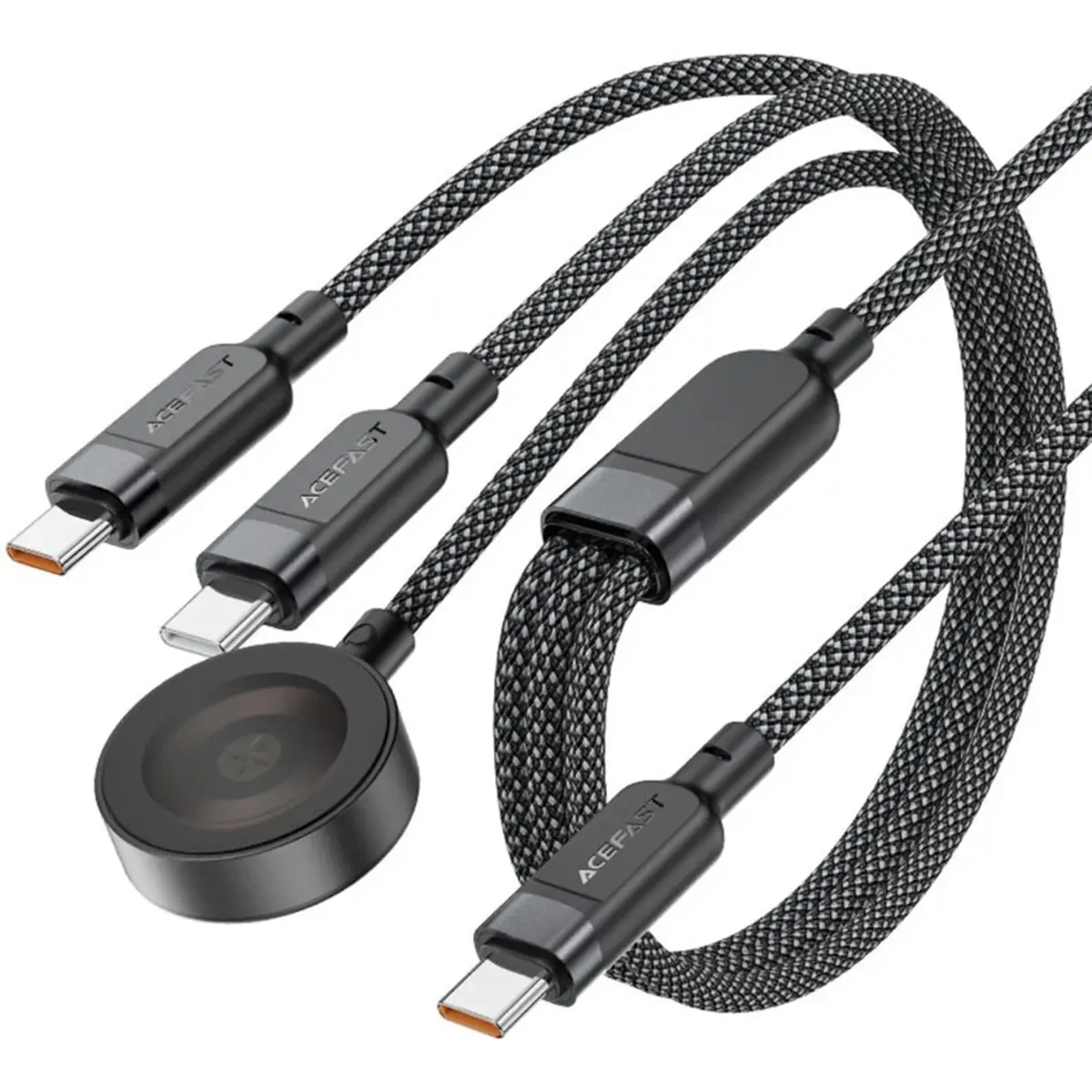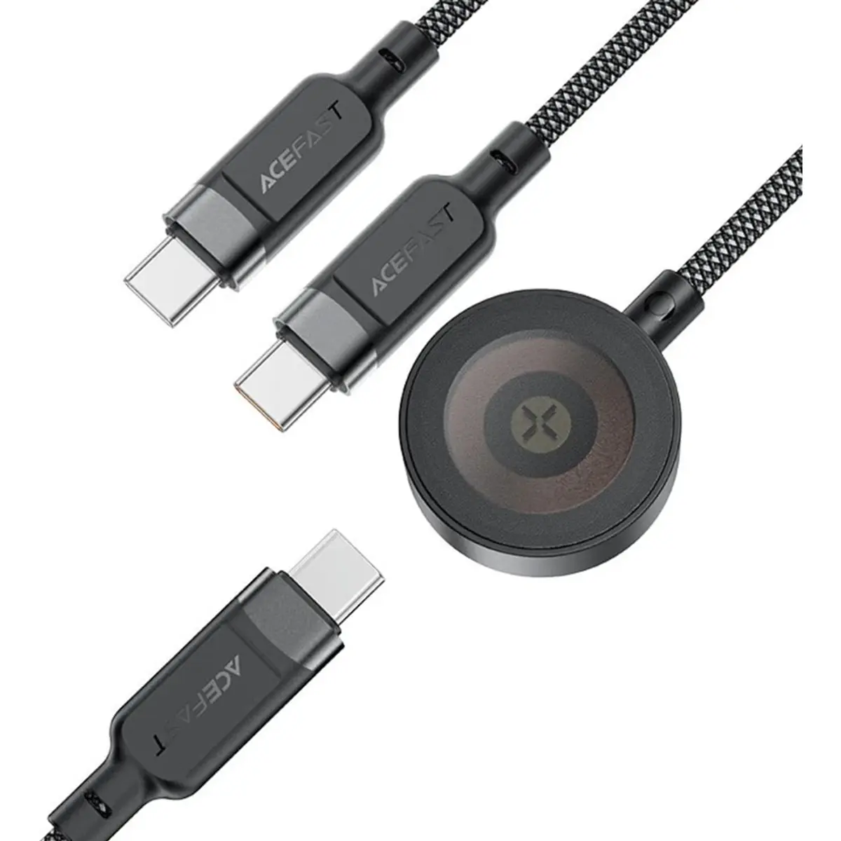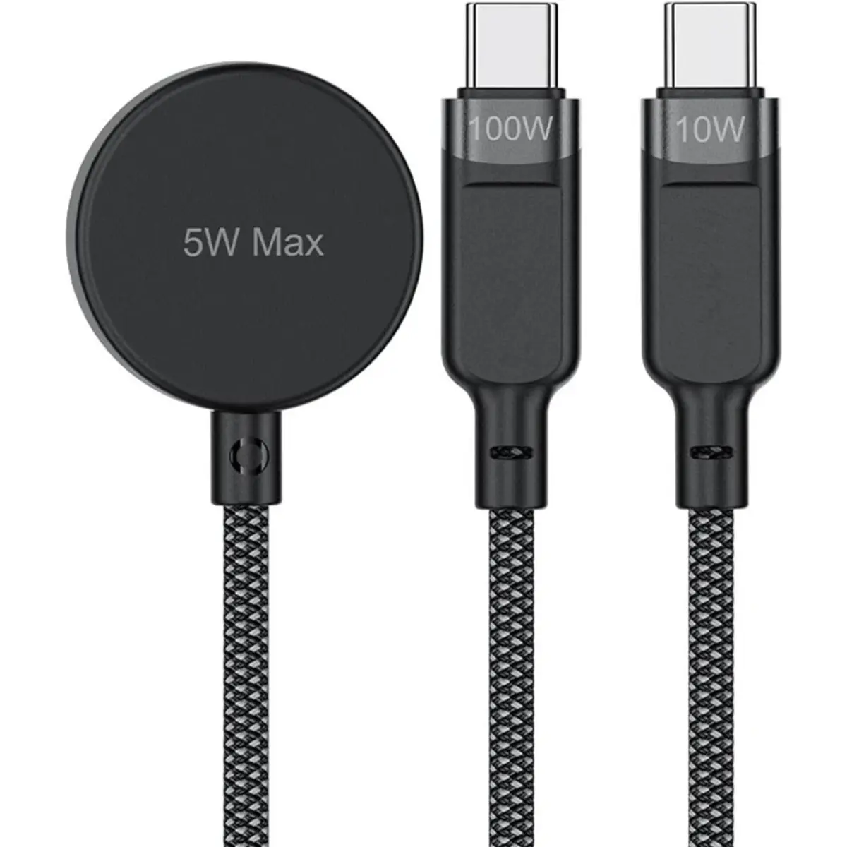 Cabo inovador 3 em 1 para carregamento rápido e transferência de dados. De um lado possui USB-C, do outro oferece duas saídas USB-C (100W + 10W) e carregamento sem fios 5W Qi para Apple Watch. Revestimento trançado durável e flexível garante resistência a danos mecânicos e uso prolongado.