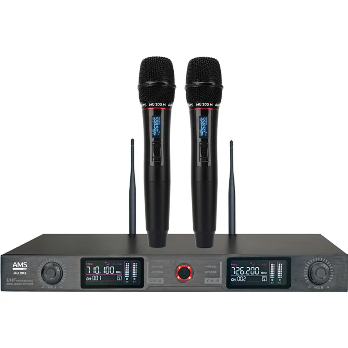 Sistema sem fios UHF de 2 canais, composto por recetor e dois microfones de mão dinâmicos, indicado para aplicações de som ao vivo, apresentações, eventos e instalações fixas. Os microfones incluem ecrãs LCD informativos, enquanto o recetor dispõe de controlo de volume independente por canal e indicadores claros de níveis AF, RF e frequência de emissão. As saídas balanceadas individuais e a saída mista desbalanceada permitem integração flexível com diferentes sistemas de áudio.
