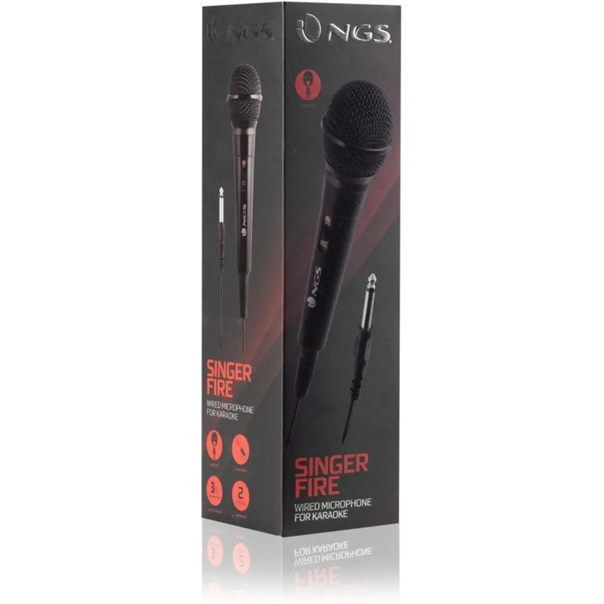 O NGS Singer Fire é um microfone com fio concebido para utilização em karaoke, apresentações, conferências ou eventos onde se pretende captar voz de forma simples e eficaz. Possui um cabo com 3 m de comprimento que proporciona liberdade de movimento, além de um botão ON/OFF integrado para controlo prático durante a utilização. Equipado com um conector jack de 6,3 mm, compatível com a maioria dos amplificadores, mixers e sistemas de som, é um microfone unidirecional que facilita a captação da voz principal e reduz a captação de ruído ambiente. Este modelo destaca-se pela simplicidade e facilidade de utilização, sendo uma opção acessível para utilizadores domésticos ou aplicações não profissionais.