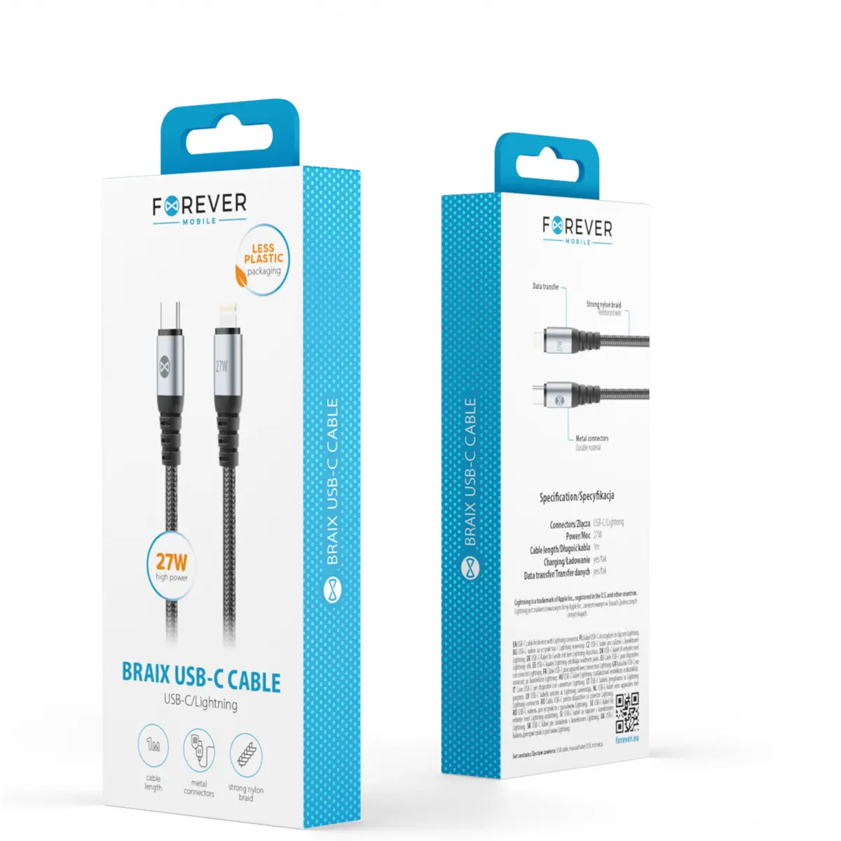Forever Braix - Cabo USB-C PD ⇿ Lightning 27W - revestido a nylon - 1m