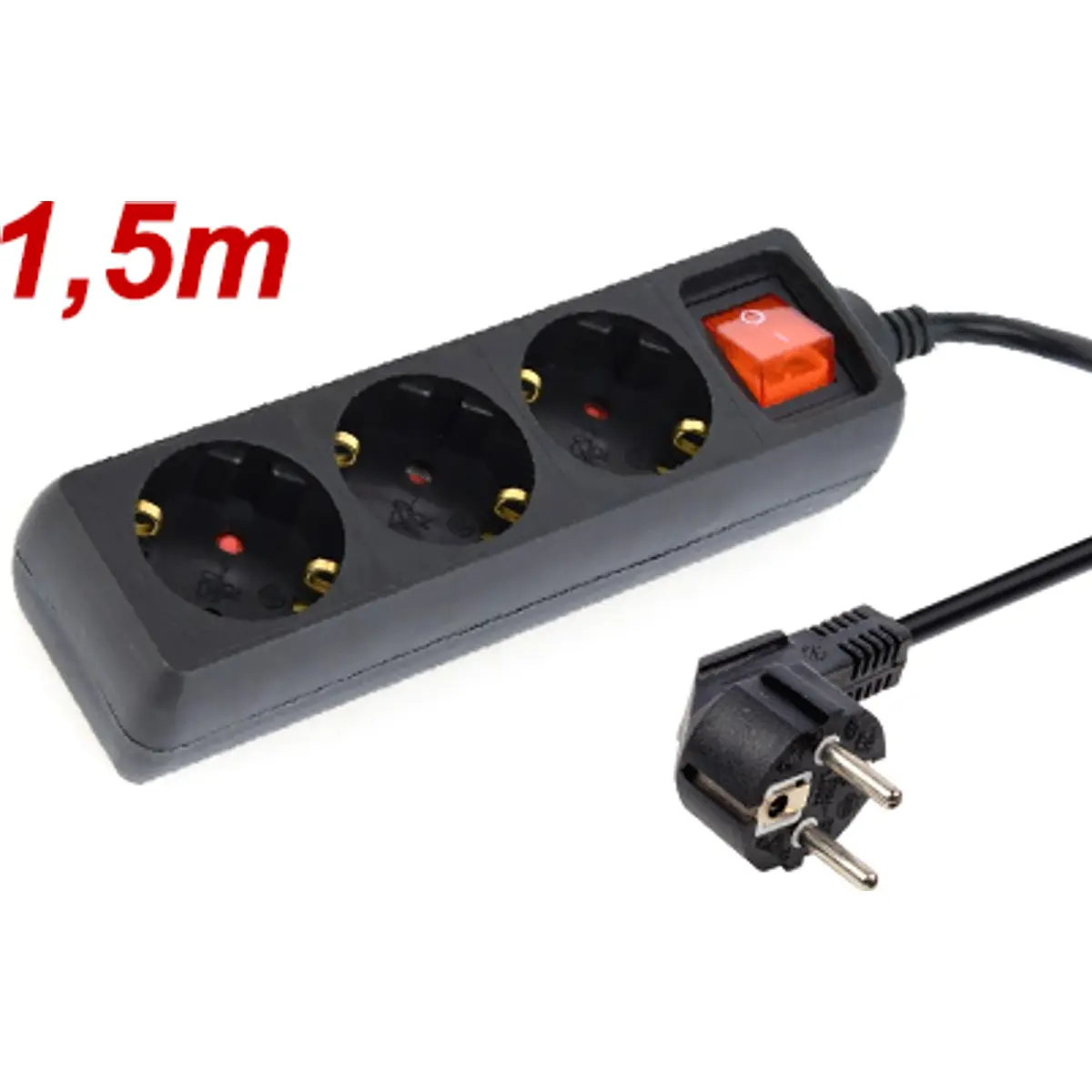 Bloco de tomadas com interruptor, cabo de 1,5 m e condutores de 3x1,5 mm², concebido para ligar até três dispositivos com segurança. Suporta até 250 V, 16 A e potência máxima de 3680 W. Possui proteção para crianças, tomadas 2P + Terra e acabamento preto, ideal para uso doméstico ou de escritório.