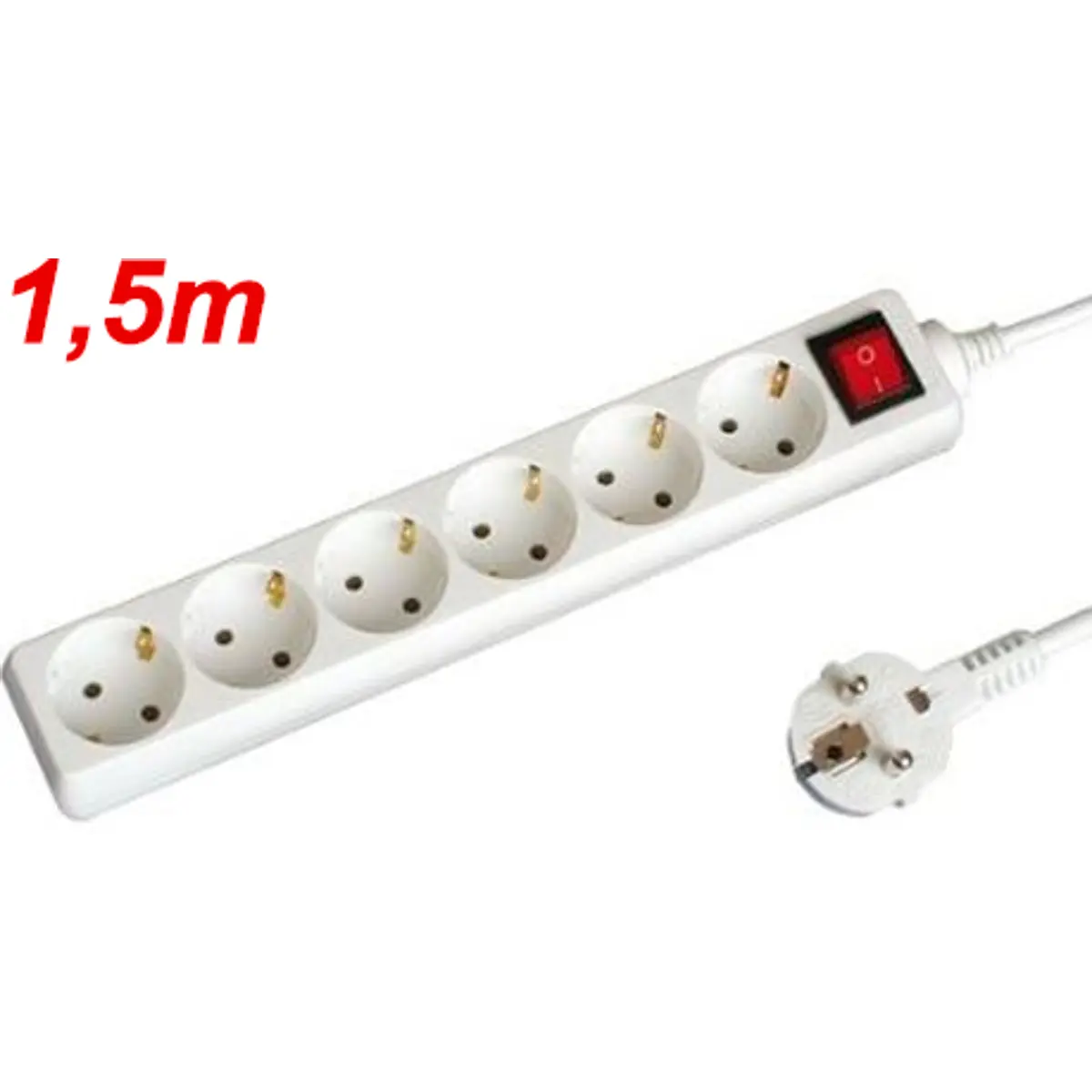 Este bloco de tomadas com interruptor oferece seis tomadas a 250 V, suportando até 16 A e potência máxima de 3680 W, ideal para alimentar vários dispositivos em casa ou no escritório. Possui cabo de 1,5 m segundo o padrão H05W-F, condutores de 3 x 1,5 mm² e proteção para crianças. Com cor branca, é robusto, compacto e adequado para montagem em mesa ou junto a tomadas existentes, promovendo organização, segurança e facilidade de uso.