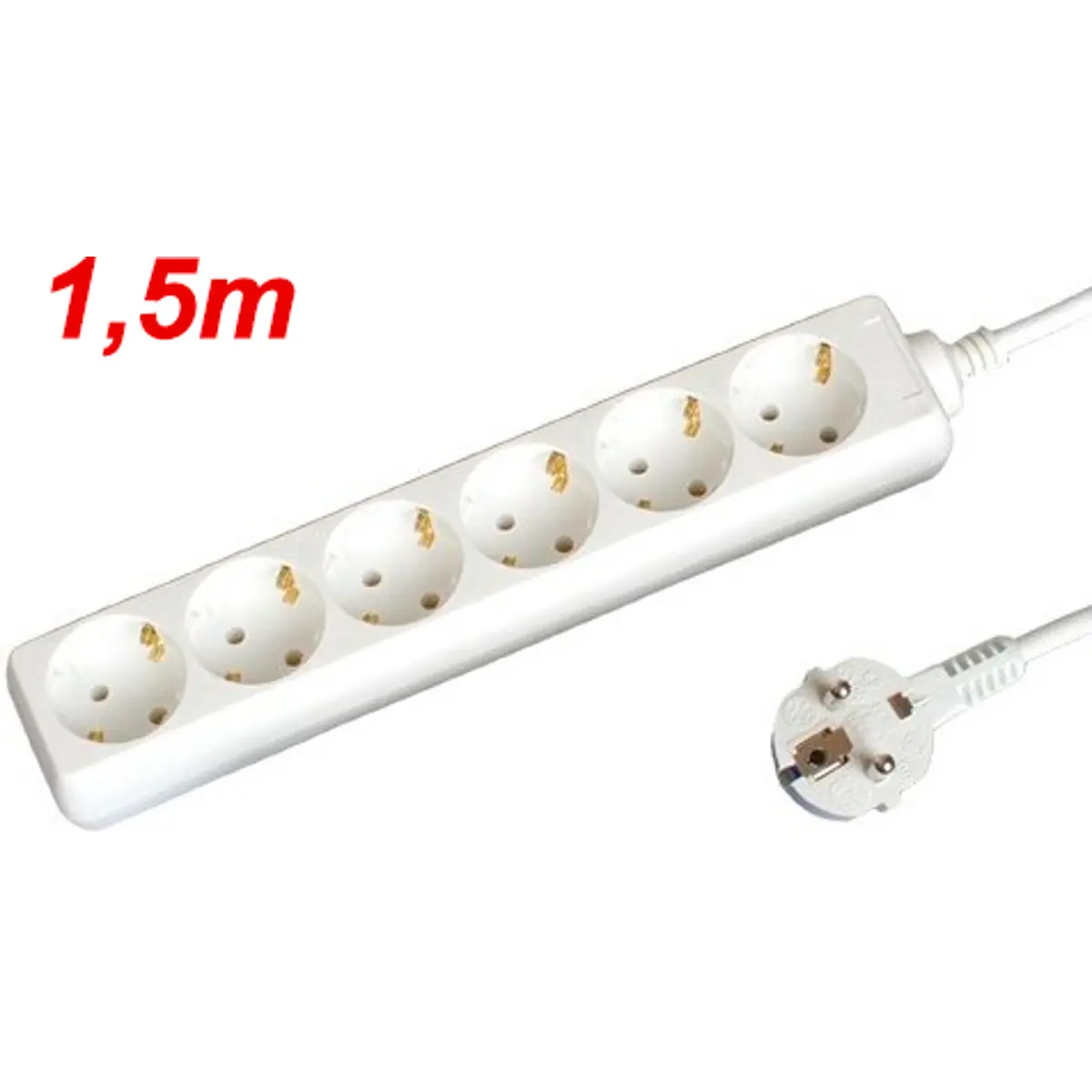 Bloco de tomadas com base múltipla para uso interior, com 6 tomadas do tipo Schuko e cabo elétrico de 1,5 m. O cabo é H05VV-F, com secção 3x1.5mm, sem interruptor e potência máxima de 3500 W. Ideal para organizar instalações domésticas, mantendo a estética branca. Este equipamento oferece organização prática, confiabilidade e capacidade para ligar vários dispositivos ao mesmo tempo numa única fonte, com montagem simples e boa durabilidade para ambientes internos.