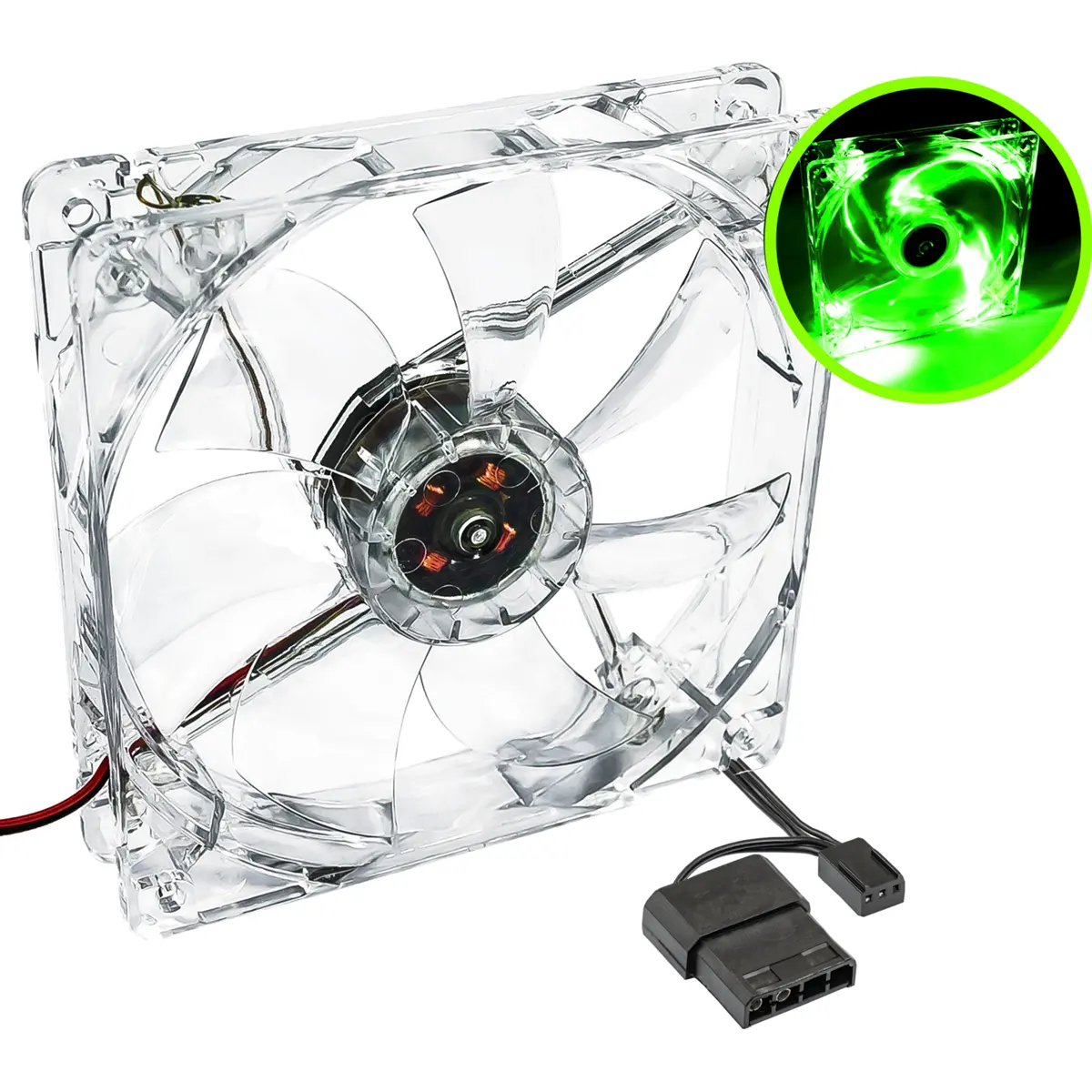 Akyga AW-12A-BG - Ventoinha 120x120x25mm 12VDC 0.1A 1.2W - Ligação Molex + 3 Pin - Transparente c/ luz VERDE