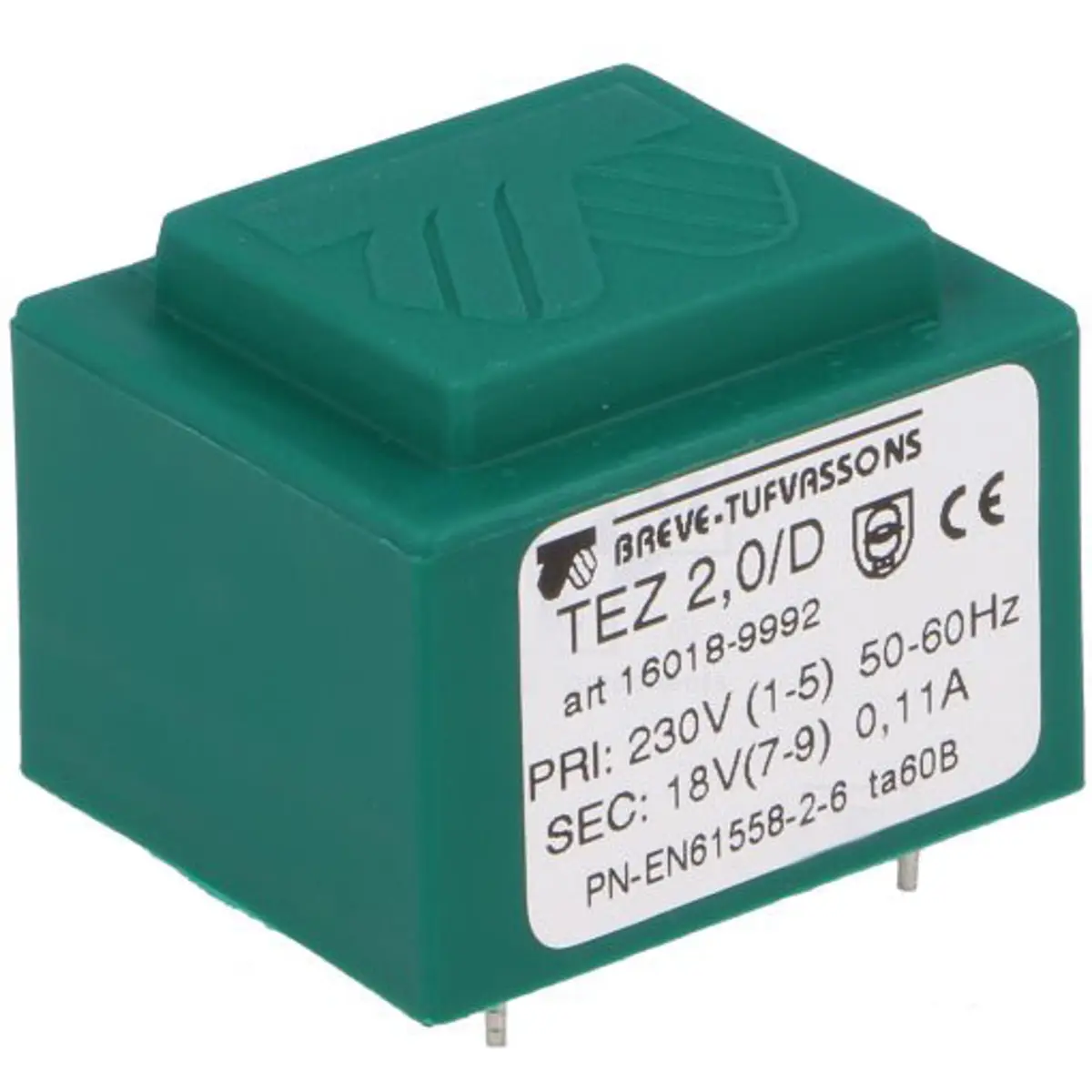 Transformador encapsulado para PCB com entrada de 230 VAC e saída de 18 V, potência nominal de 2 VA. Montagem em PCB, peso de 90 g e dimensões aproximadas: A 28 mm, B 33 mm, C 24 mm. Classe térmica Ta60B e índice de proteção IP00. Em conformidade com as normas PN-EN 61558-1:2000, PN-EN 61558-2-1:2000 e PN-EN 61558-2-6:2000. Ideal para fontes de alimentação de baixa potência em equipamentos, fornecendo isolamento elétrico básico e construção compacta.
