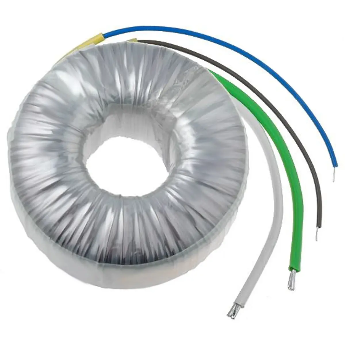 Transformador toroidal de potência 230/12V com 300VA, fornece 12V de secundário estável até 25A. Construção compacta, ligação por fios, peso 2.5Kg e dimensões Ø117x61 mm.