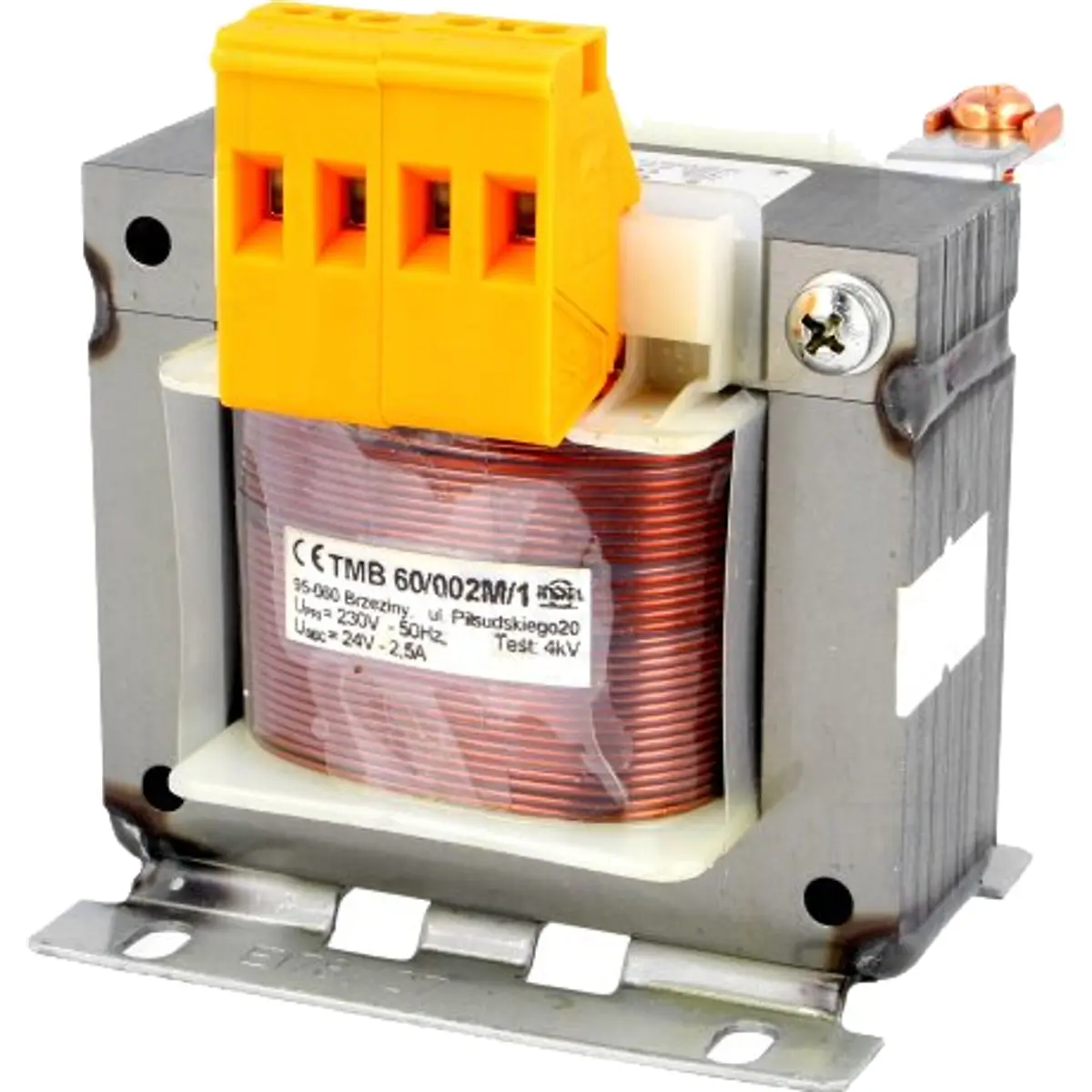 Transformador convencional com entrada 230V AC e saída 24V, com 60 VA de potência, ideal para montagem em bloco terminal. Oferece até 2,5 A, montagem por parafuso, peso de 1 kg e classe térmica Ta40B, com proteção IP00. Compatível com PN-EN 61558, adequado para equipamentos internos que requerem isolamento, fiabilidade e conformidade normativa.