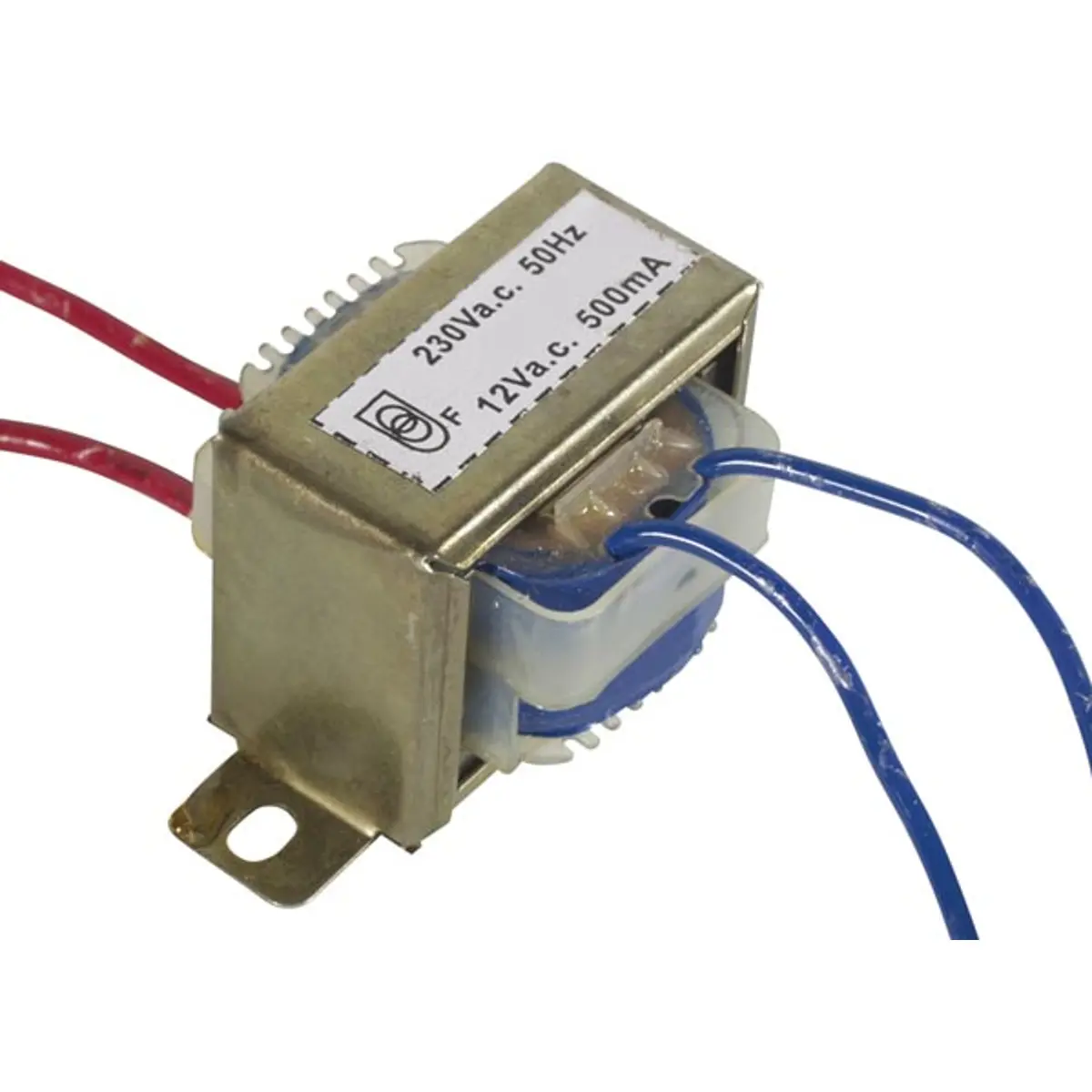 Transformador convencional com entrada de 230V AC e saída de 12V AC, oferece corrente de 500 mA e potência de 6 VA. Pesa 225 g e tem dimensões de 35 x 43 x 40 mm. Ideal para alimentar circuitos de baixa tensão, com especificações simples e confiáveis, a partir de uma rede de energia padrão.