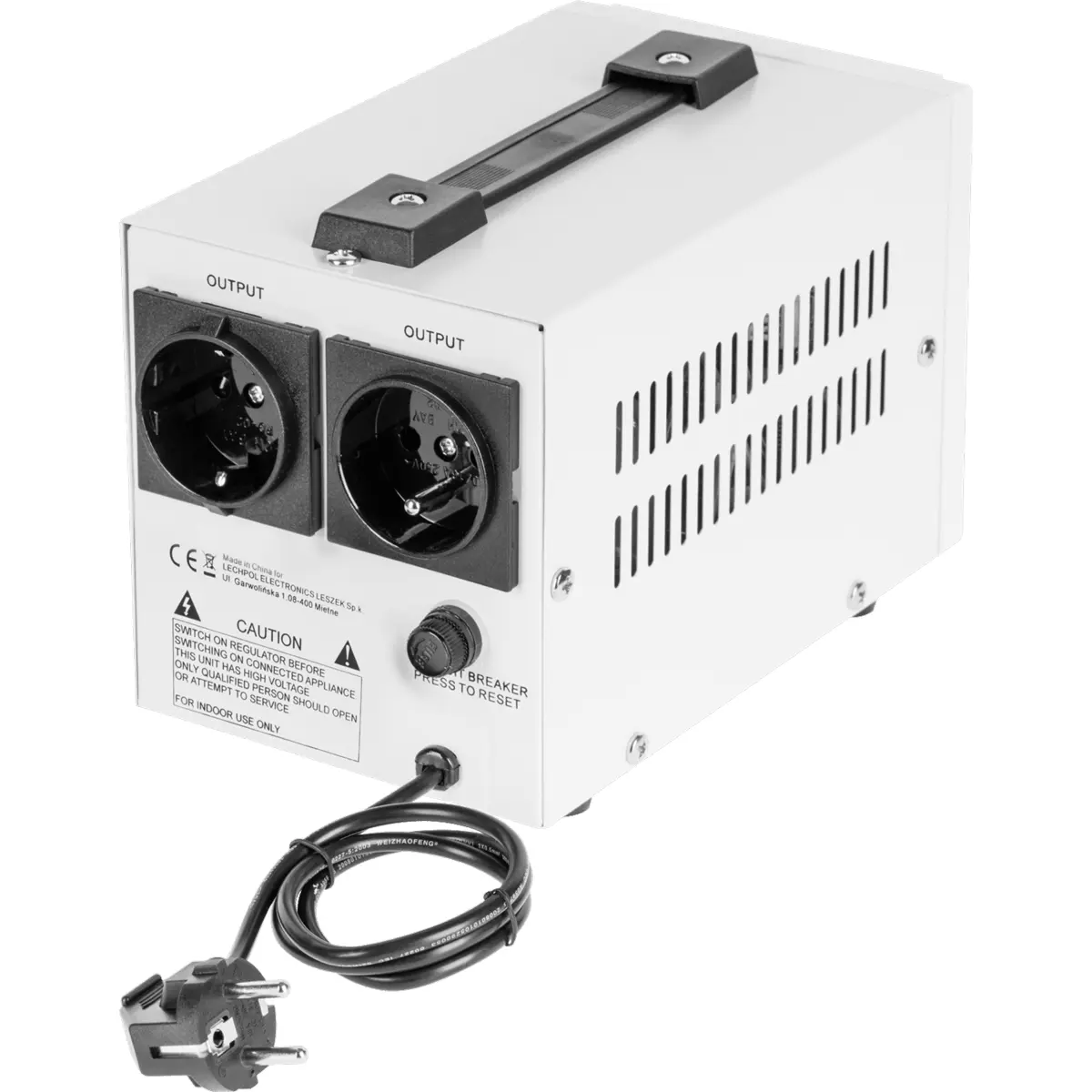 Estabilizador de tensão automático de 500VA que regula a tensão de entrada entre 145 e 260 VAC para fornecer 230 VAC de saída, com frequência de 50/60 Hz. Possui eficiência de 98% e proteção contra sobretensão, subtensão, sobreaquecimento e curto-circuito. Visor LED indica o estado atual e permite montagem na parede. Opera entre -15°C e 45°C e entre 10% e 90% de humidade relativa. Ideal para proteger equipamentos sensíveis em ambientes com variações de tensão.