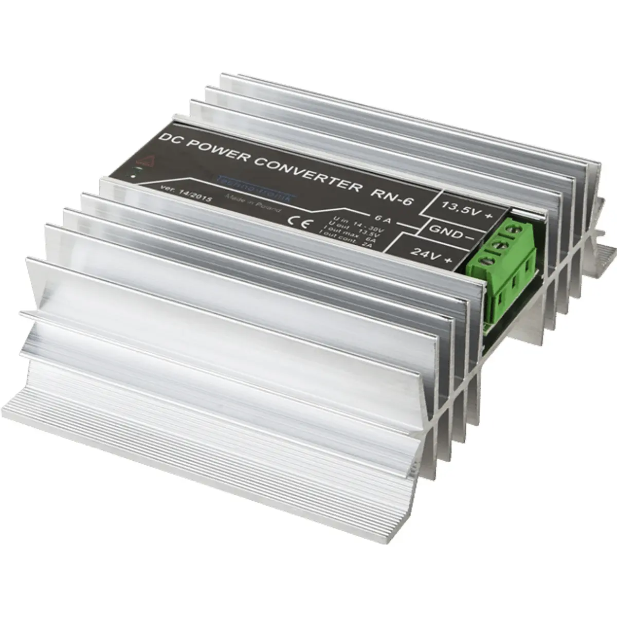 Conversor DC-DC que transforma tensões de entrada entre 14 e 30 V em uma saída estável de 13,5 V, com corrente instantânea máxima de 6 A e corrente contínua máxima de 2 A. Possui proteções contra sobrecarga, curto-circuito e sobretensão, e dimensões compactas (100 x 130 x 40 mm), ideal para alimentação de equipamentos automotivos e sistemas industriais que requerem conversão de potência fiável.