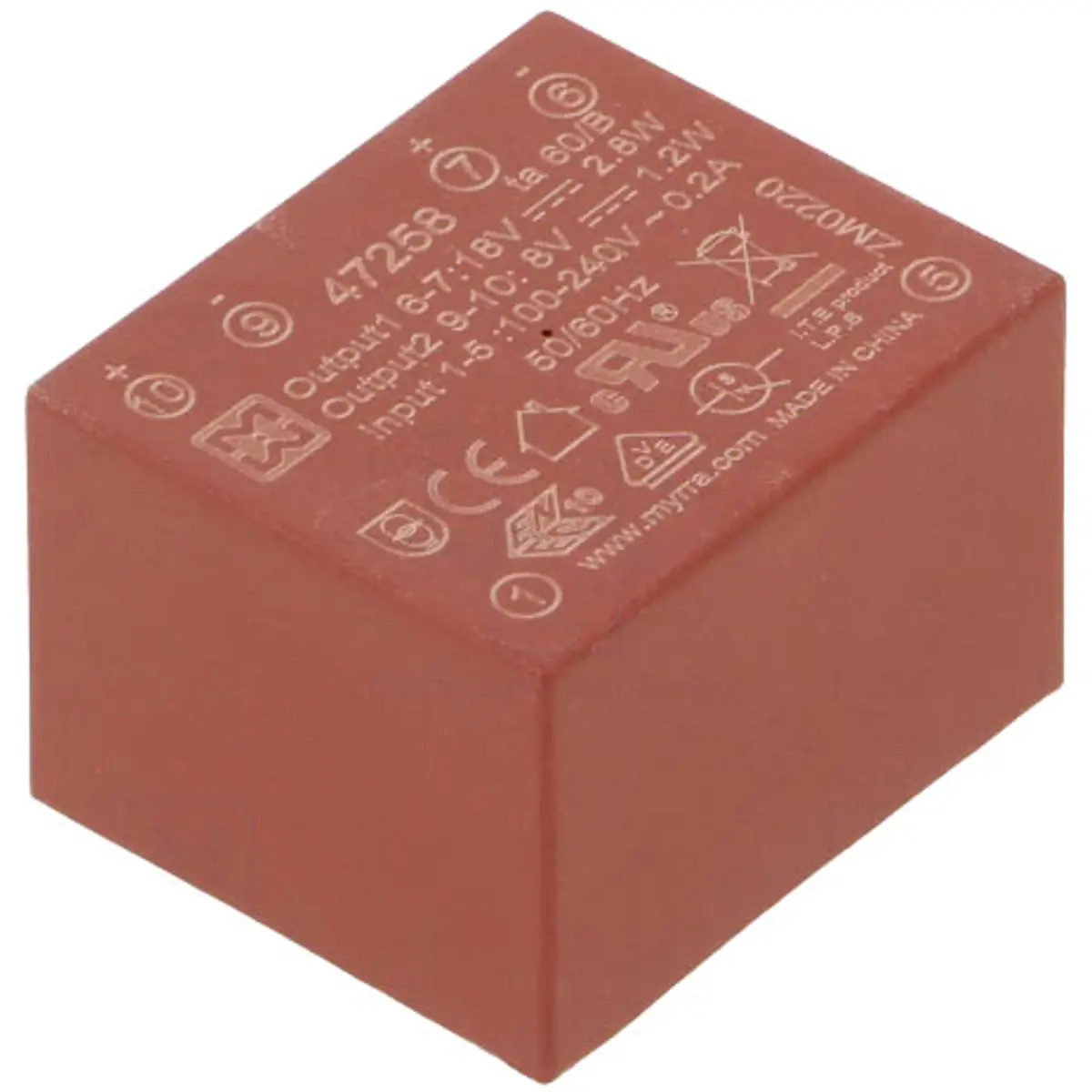 Transformador encapsulado p/ PCB 110…230V AC/DC -> 8V + 18VDC 150mA 4W - MYRRA 47258 Transformador encapsulado p/ PCB 110…230V AC/DC -> 8V + 18VDC 150mA 4W - MYRRA 47258
