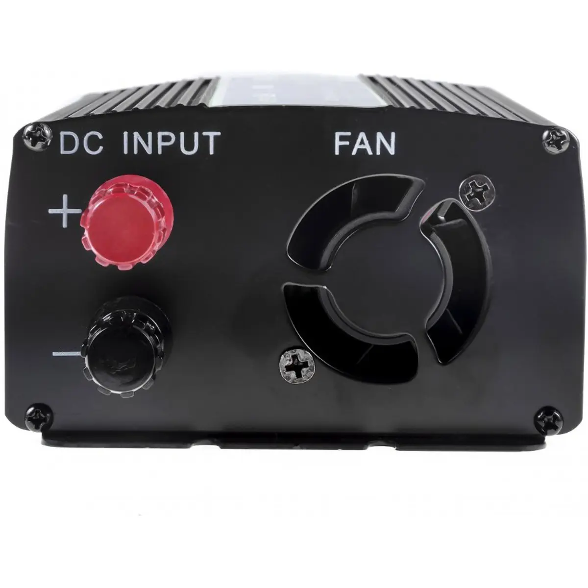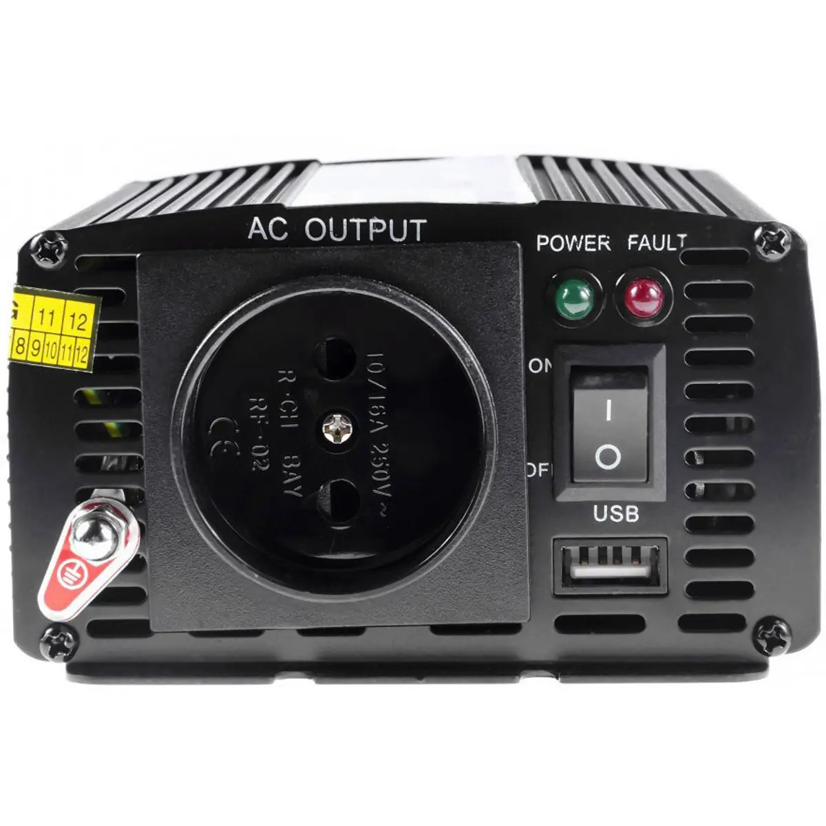 Inversor de 24V DC para 230V AC com onda sinusoidal modificada, ideal para alimentar dispositivos longe da rede. Oferece 300W de potência contínua e picos de 600W, com porta USB, tomada Schuko e ficha de isqueiro; suporta duas baterias de 12V em série. Possui proteções contra sobretensões e sobreaquecimento, eficiência de 85% e ventilação inteligente, promovendo funcionamento estável e seguro com consumo moderado.