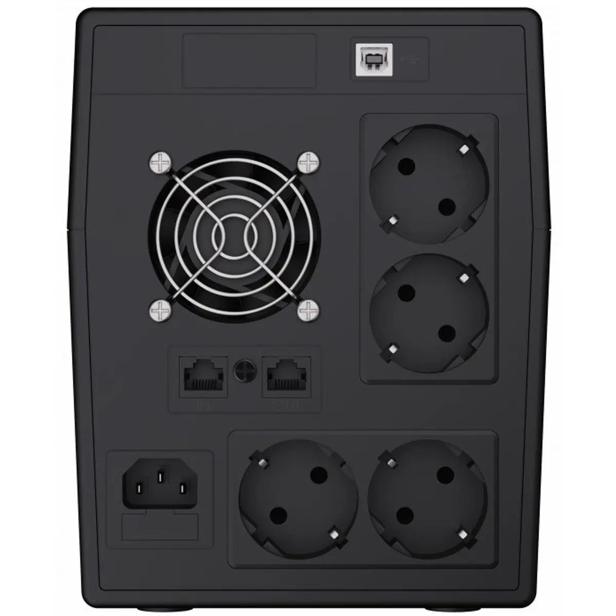 Fonte de alimentação ininterrupta de 2000VA (1200W) com saída em onda sinusoidal modificada e modo linha interativa AVR. Fornece energia contínua em caso de falha de energia, com proteção contra sobrecarga e sobretensão. Inclui monitor LCD, USB e RJ45, quatro tomadas Schuko e baterias de 2 x 12V 9Ah. Aceita entrada 220/230/240 Vac em 50/60 Hz com detecção automática de frequência de saída. Tempo de resposta típico entre 2 e 6 ms (máx. 10 ms). Dimensões: 380 x 158 x 198 mm; peso: 11 kg.
