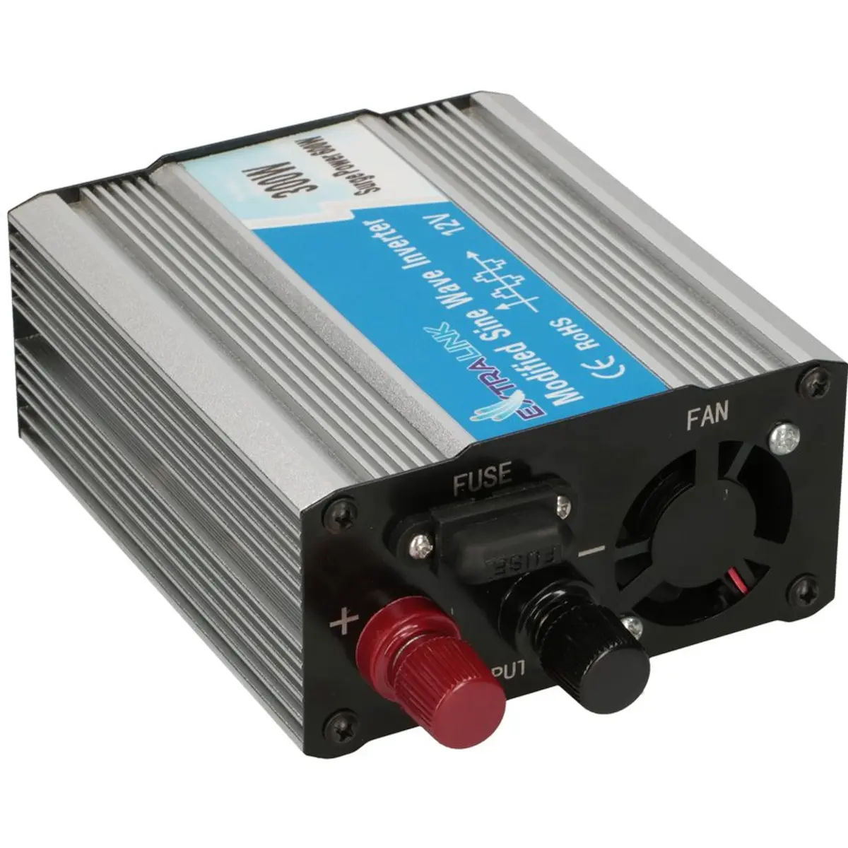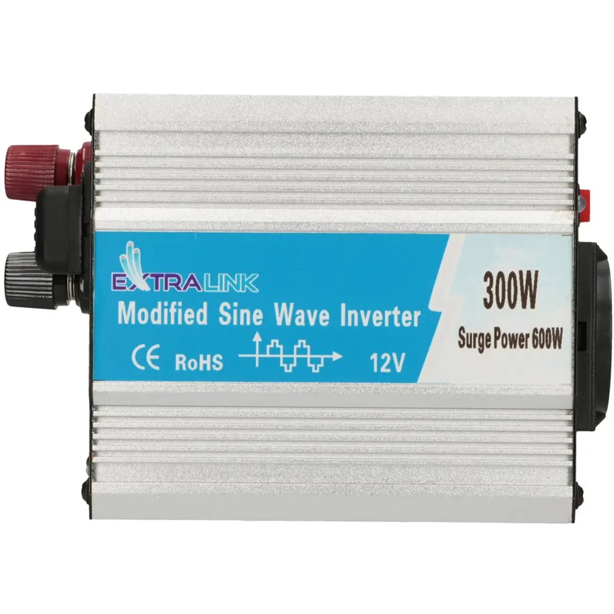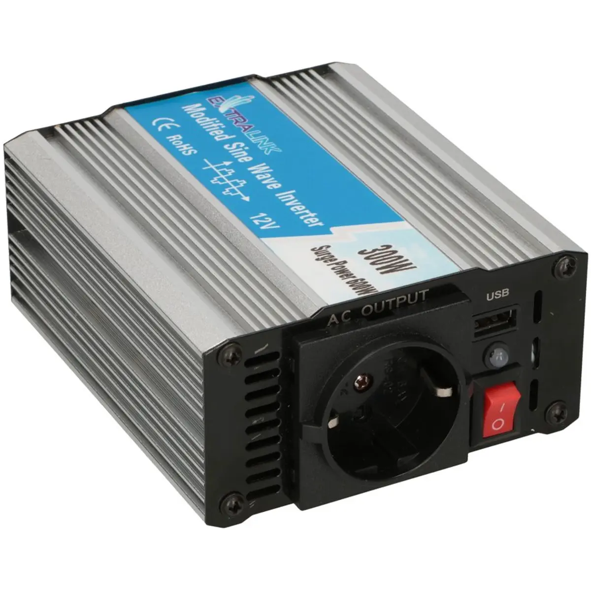 O inversor de tensão Extralink OPIM-300W é um dispositivo que converte a tensão de saída de uma bateria (corrente contínua, DC) em 230V AC (corrente alternada). 230V AC é o tipo de corrente fornecida pelos serviços públicos para alimentar aparelhos domésticos comuns, tais como televisão, frigorífico, rádio, iluminação ou para carregar um computador portátil/telemóvel, etc.