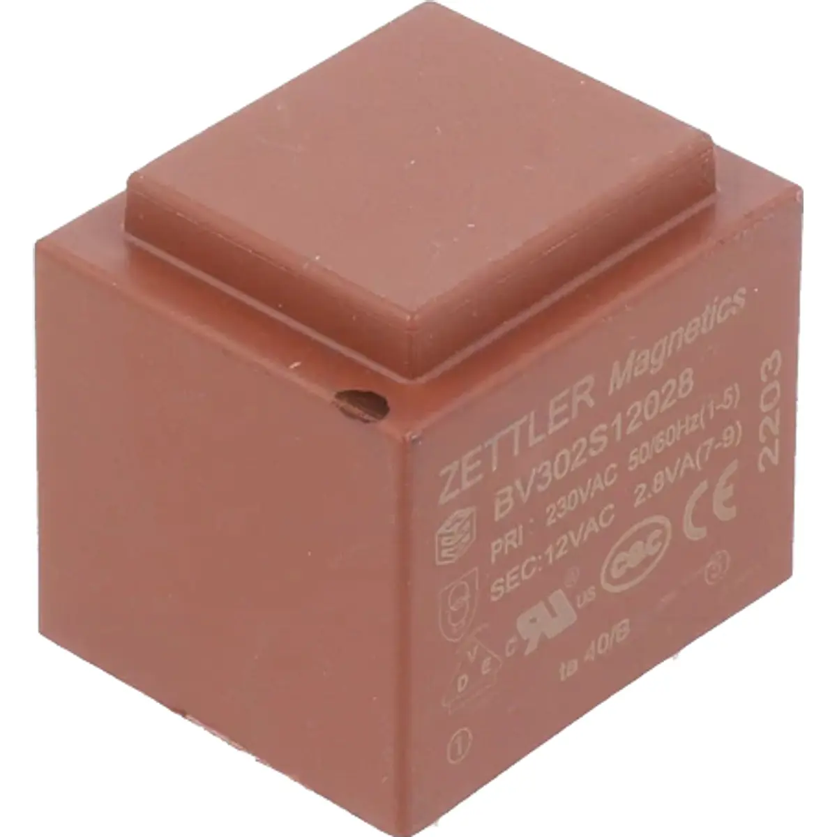 Transformador encapsulado para PCB com entrada 230V AC e saída 12V, potência nominal 2.8VA e corrente de enrolamento secundário de 233 mA. Classe térmica T 40B e dimensões externas de 32,8 x 27,8 x 29,8 mm. Montagem em PCB para integração em circuitos eletrónicos que requerem conversão de 230V AC para 12V.