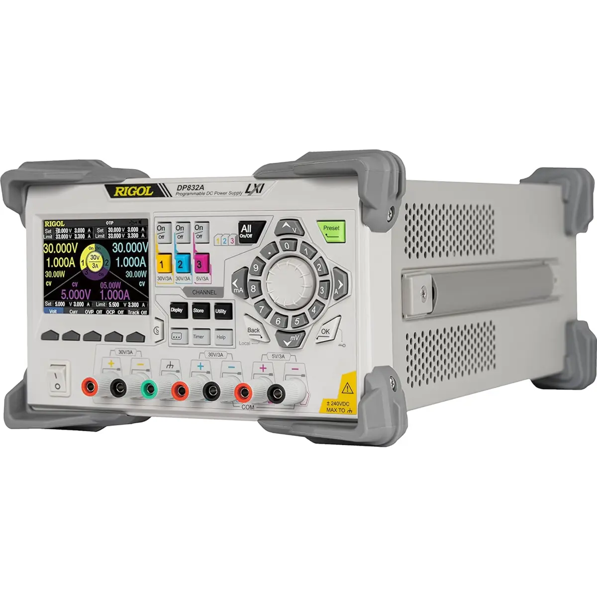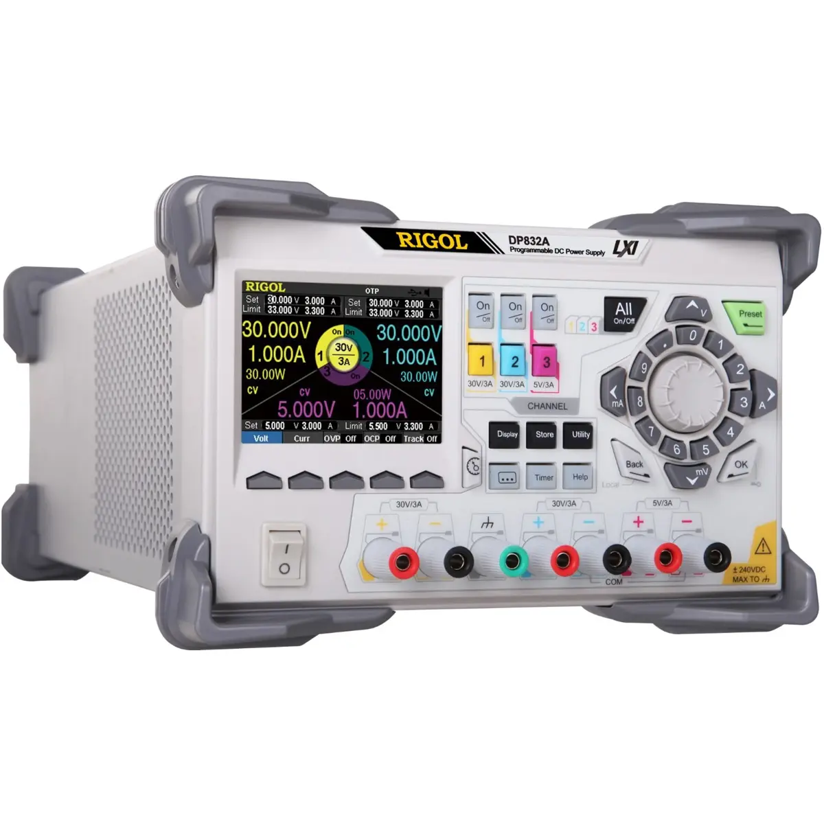 Fonte de alimentação DC programável, com três canais de saída (0…+30V / 3A, 0…+30V / 3A, 0…+5V / 3A, DC, máx. total de 195 W).