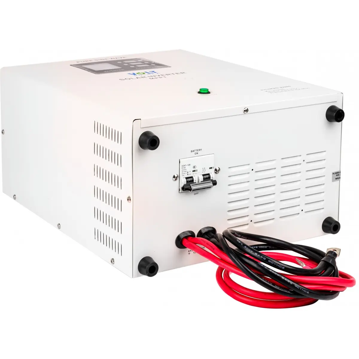 - Ecrã LCD que informa sobre o estado atual de operação do dispositivo, incluindo tensão de entrada e saída, tensão e carga da bateria