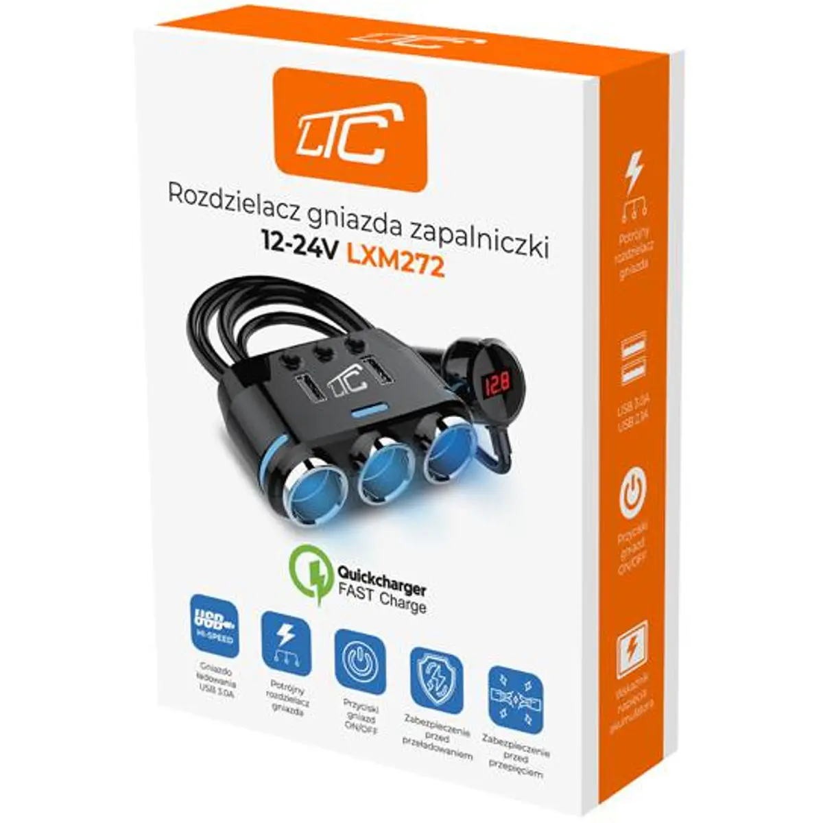 O distribuidor de tomadas de isqueiro automóvel de alta qualidade da marca LTC permite dividir a alimentação de uma única tomada de isqueiro em três tomadas adicionais, uma porta USB-A QC e uma porta USB-A 2.1A.