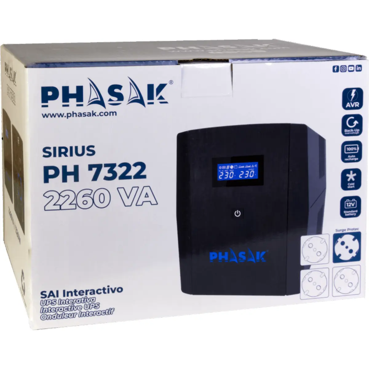 Phasak Sirius PH 7322 - UPS interativa 2260VA 1320W c/ 4x Schuko (1x Surge Protect) + USB HID e Display LCD