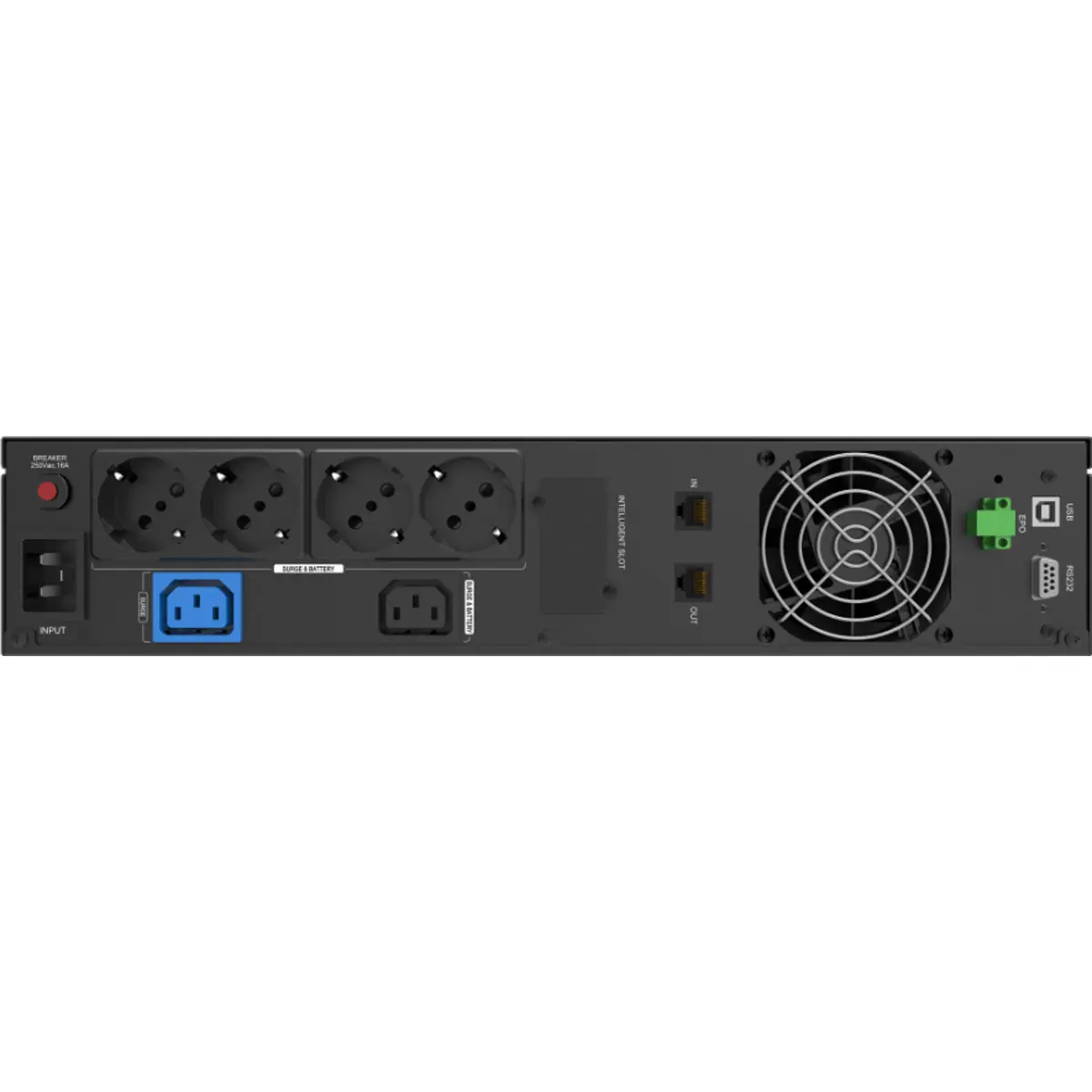 UPS rack de 19 polegadas com potência nominal de 3060 VA (1800 W) para centros de dados, servindo servidores em cluster e infraestruturas de missão crítica. Oferece onda sinusoidal pura, regulação automática de tensão (AVR) e quatro baterias de 12 V 9 Ah para maior autonomia. Possui 4 tomadas Schuko e 2 IEC, proteção contra picos e sobretensões, display digital com leitura de corrente e alarmes, e conectividade USB HID, RS232, RJ45, EPO e SNMP (opcional). Compatível com gerador, assegurando energia limpa e disponibilidade contínua.