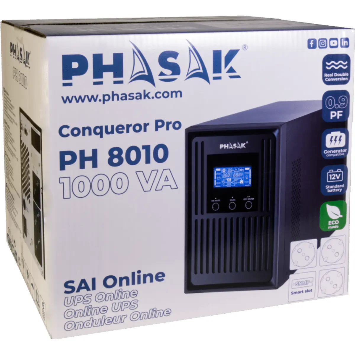 Phasak Conqueror Pro PH 8010 - UPS online 1000VA 900W c/ 3x Schuko + USB HID e Display LCD