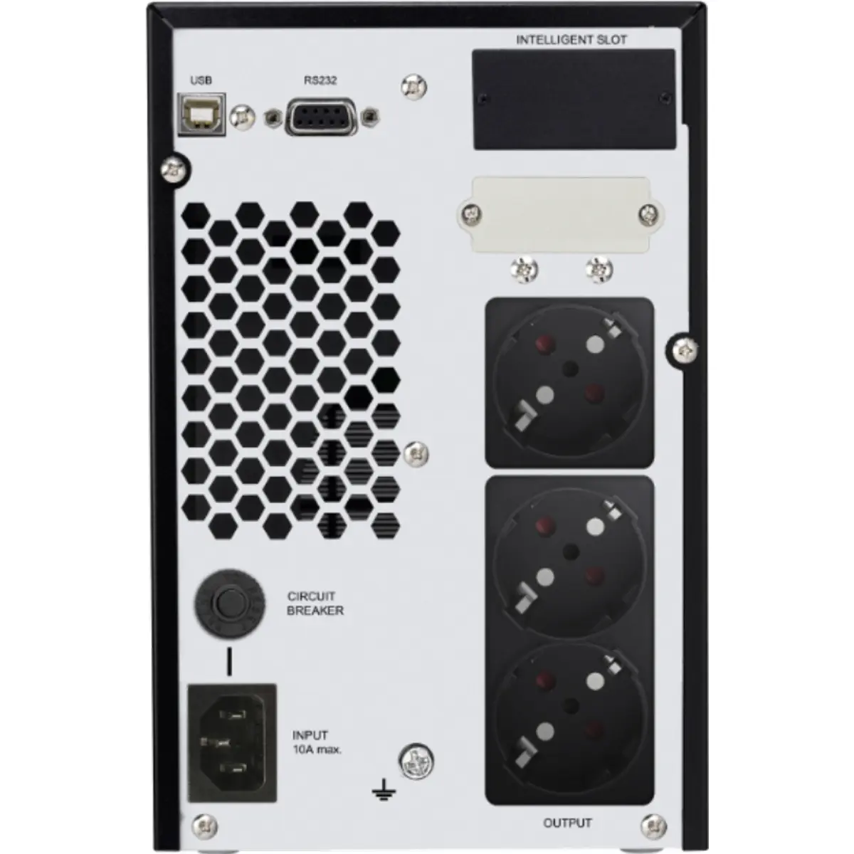 UPS online de 1000 VA / 900 W com dupla conversão fornece alimentação estável com onda sinusoidal pura. Possui ecrã LCD para monitorização em tempo real, interfaces USB HID, RS232 e slot SNMP (opcional) para gestão remota. Compatível com geradores e bancos de baterias externos, com 3 tomadas Schuko e modo ECO para eficiência. Transferência sem interrupção: 0 ms em AC e 4 ms em bypass. Entrada 208–240 Vac, 40–70 Hz, fator de potência ≥ 0,95. Dimensões 282 x 145 x 220 mm, peso 9,8 kg; temperatura 0–40 °C e humidade 0–50% (sem condensação).