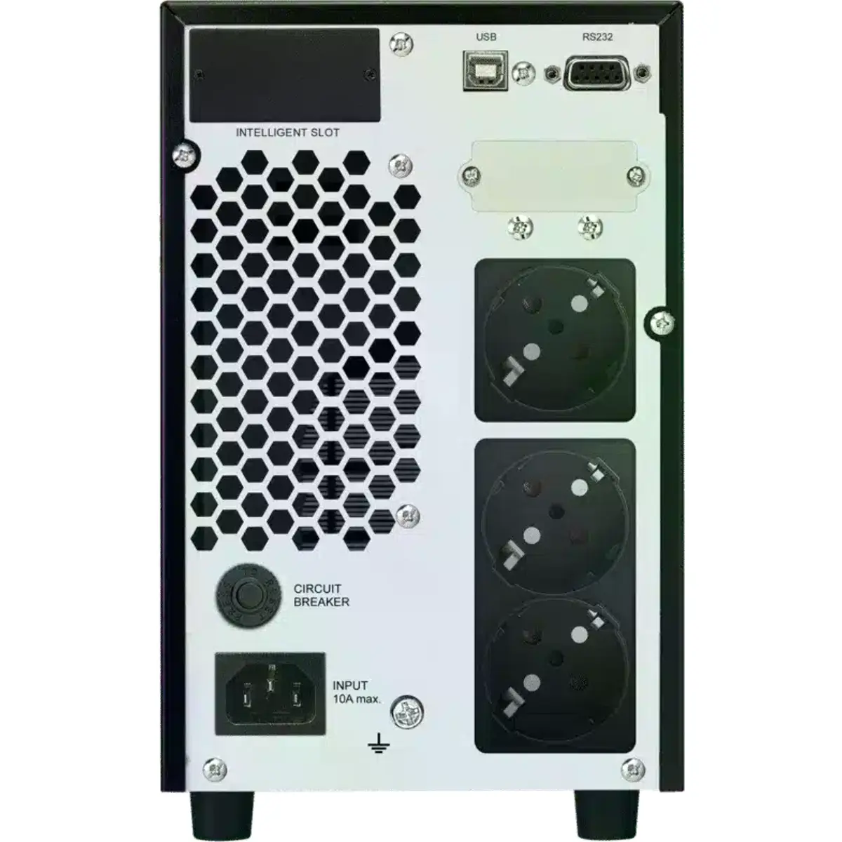 Este modelo permite monitorização local via LCD e gestão remota com SNMP (opcional). Inclui três tomadas Schuko, interfaces RS232 e USB, e é compatível com banco de baterias para autonomia adicional em instalações críticas.