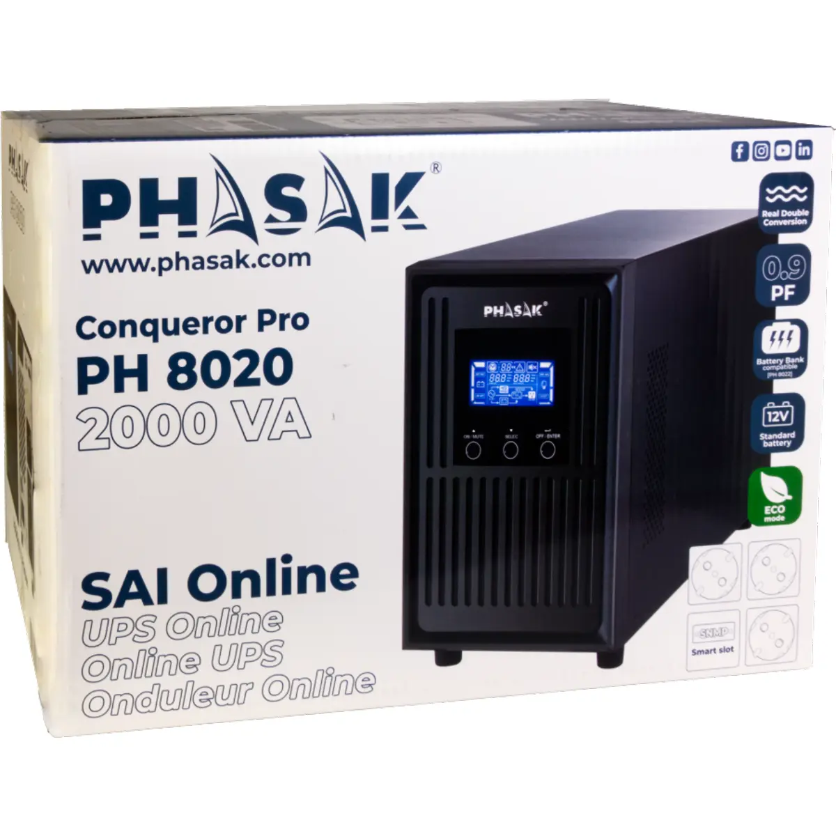 Phasak Conqueror Pro PH 8020 - UPS online 2000VA 1800W c/ 3x Schuko + USB HID e Display LCD