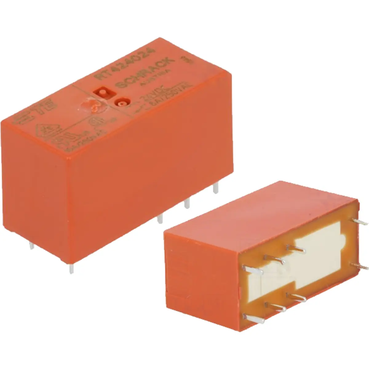 Relé eletromagnético DPDT com bobina de 24 VDC. Contatos suportam 8 A a 250 VAC e 8 A a 30 VDC, comutação até 400 V AC. Montagem em PCB; resistência da bobina 1,44 kΩ e consumo de 400 mW. Raster de 5 mm; dimensões externas de 29 × 12,7 × 15,7 mm. Ideal para controlo em circuitos elétricos com montagem em placa.