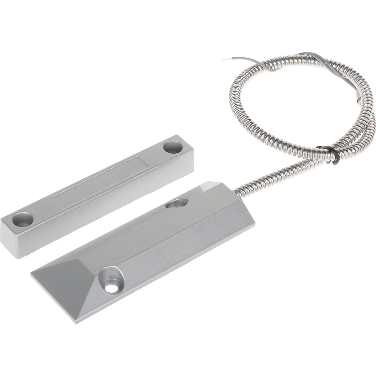 Interruptor magnético do tipo reed para portões com contacto SPST NO, comutação até 20 V e 10 mA, distâncias de fecho 40 mm e abertura 65 mm, caixa metálica reforçada e hermética, saída NO (NC quando ativo por íman). Inclui cabo de 40 cm com proteção em tubo espiral de metal de 36,5 cm. Ideal para monitorização de portas e portões, oferecendo montagem robusta e fiável para sistemas de alarme e controlo de acesso.