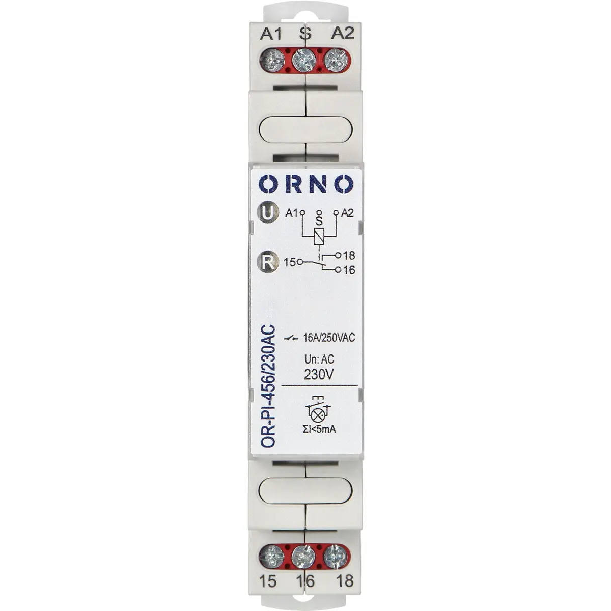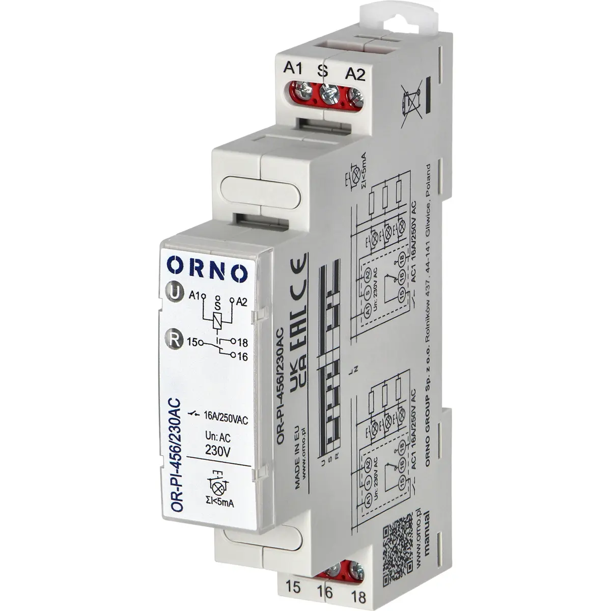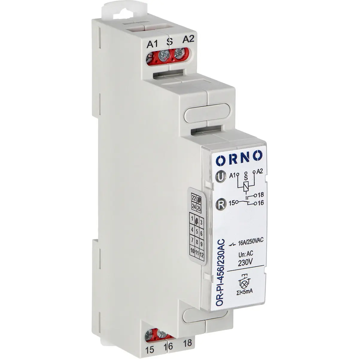 Telerruptor (Relé biestável, de impulso) para calha DIN, com alimentação de 230VAC e contactos SPDT (1 Normalmente Aberto + 1 Normalmente Fechado, com terminal comum) que suportam até 16A.