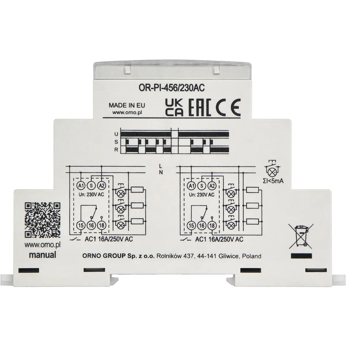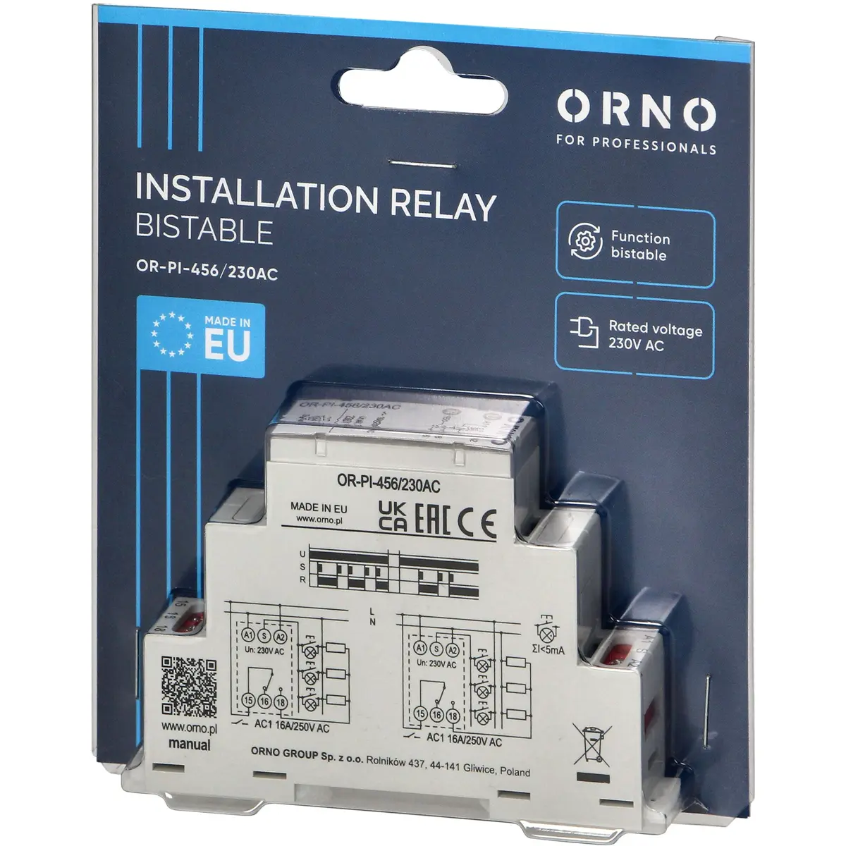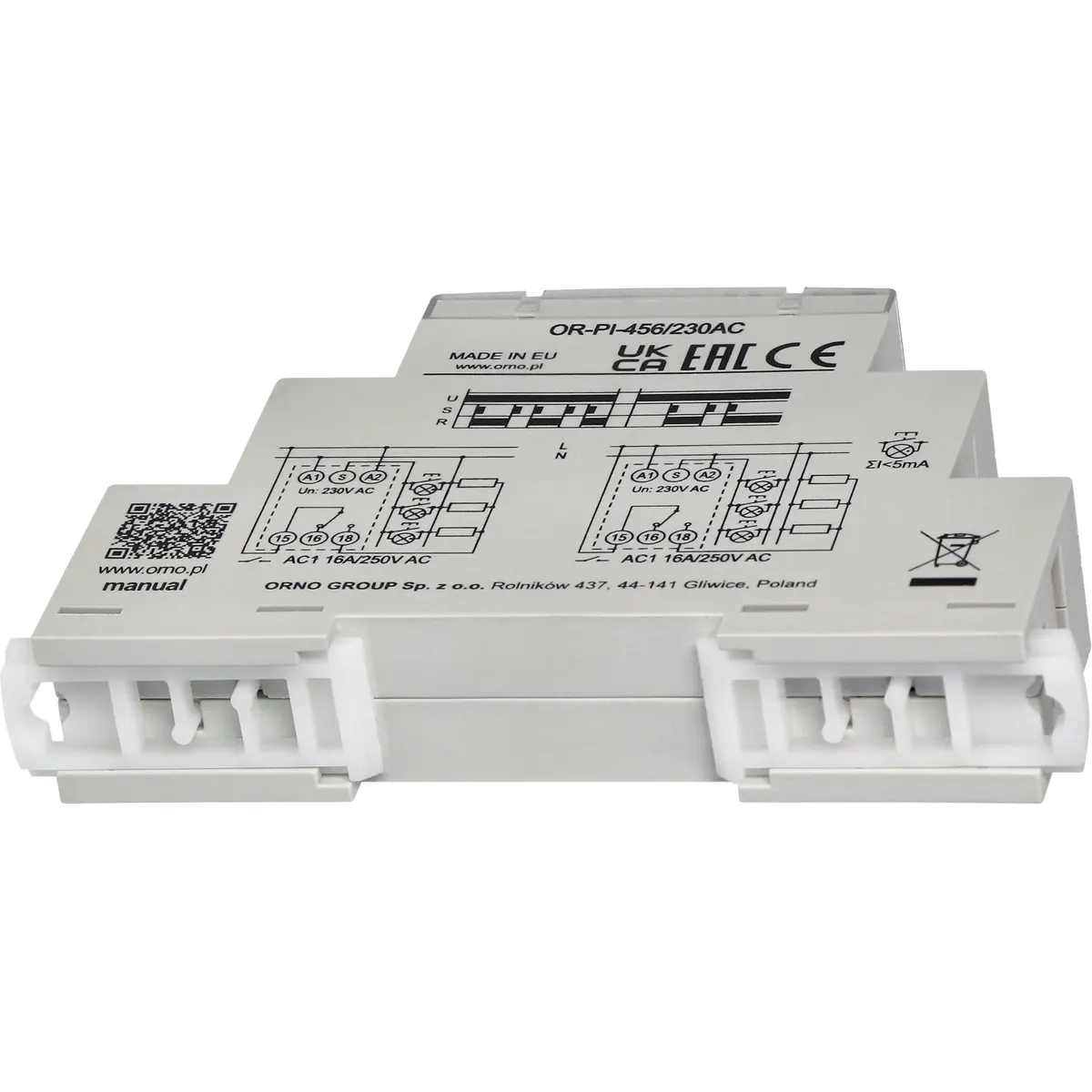 Telerruptor (Relé biestável, de impulso) para calha DIN, com alimentação de 230VAC e contactos SPDT (1 Normalmente Aberto + 1 Normalmente Fechado, com terminal comum) que suportam até 16A.