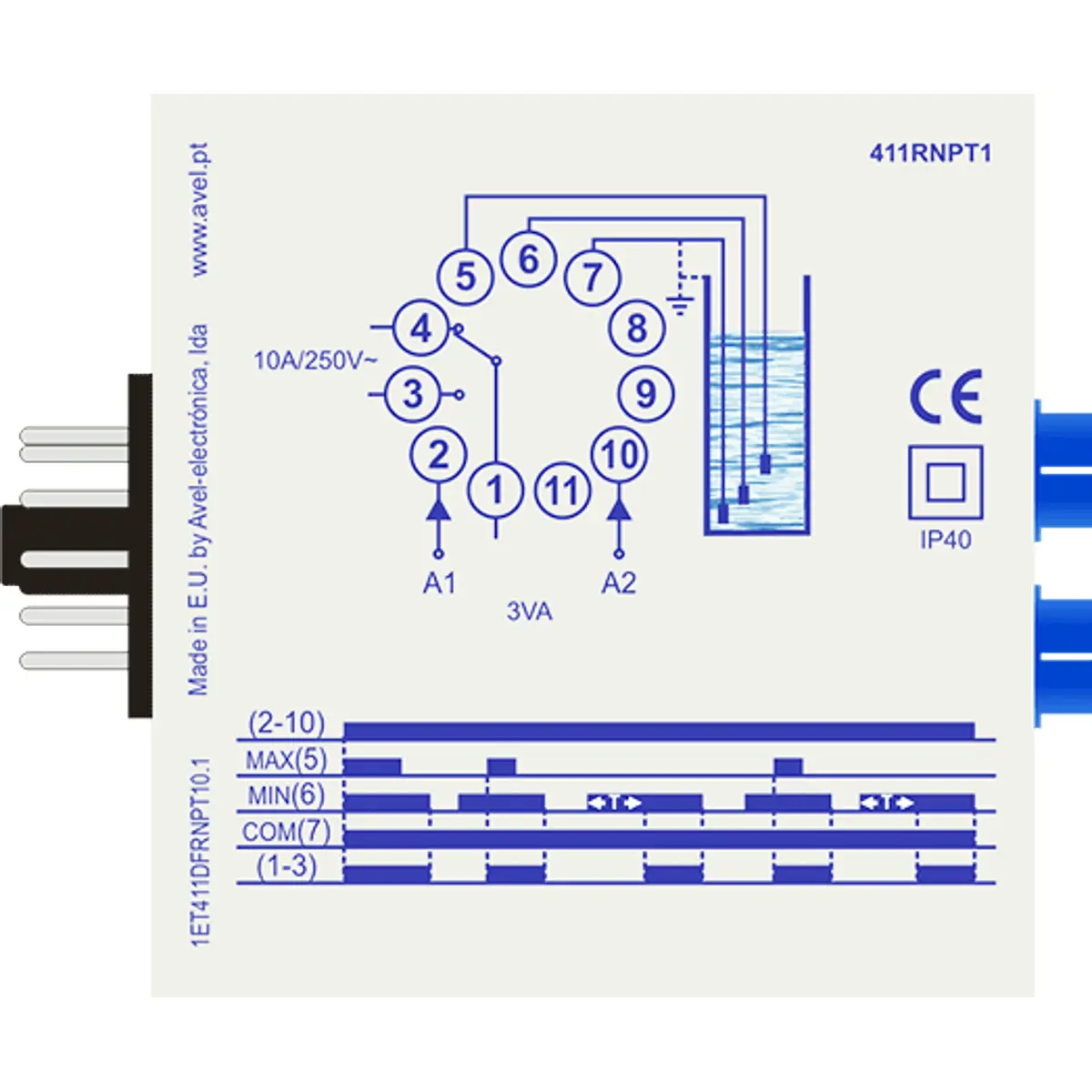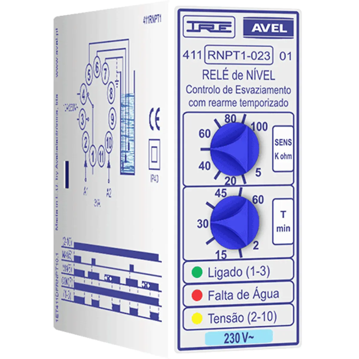 Relé de nível para controlo de esvaziamento de um poço ou furo de água, com rearme temporizado (2-60min) e ajuste de sensibilidade dos sensores. Evita que uma bomba fique a trabalhar "em seco" e, graças à sua temporização, é especialmente útil em situações de recuperação lenta do nível de água: