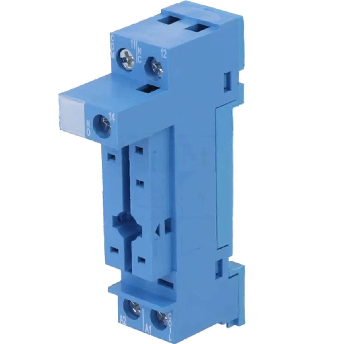 Base para relé de 5 pinos para calha DIN, compatível com a série 40.31, destinada a soluções de montagem seguras e compactas para ligações por parafuso. Possui tensão nominal até 250V AC e corrente de 10A, suportando temperaturas de -40°C a 70°C. Ideal para aplicações industriais, com clip retrator metálico incluído e montagem fácil em calha DIN. Dimensões e peso adequados para integração eficiente em quadros elétricos.
