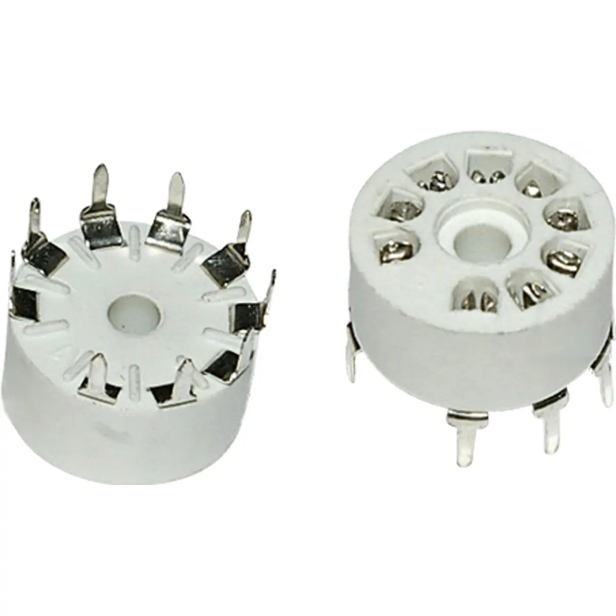 Este suporte de válvula é um soquete de montagem em PCB com corpo de cerâmica, compatível com válvulas 12AX7, 6922, ECC83 e 7025. Possui 9 pinos no formato Noval e um soquete de 18 mm, adequado para montagem em PCB. Os pinos têm diâmetro aproximado entre 17,5 e 19 mm, oferecendo uma fixação estável e boa condução elétrica. Ideal para projetos de áudio analógico que utilizem válvulas.