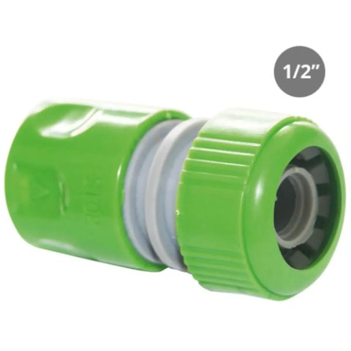 Conector rápido de mangueira Ø1/2'' (13mm) sem válvula de bloqueio, fabricado em ABS, com clique simples para ligar e desligar a mangueira à torneira ou ao bico. Disponível em verde e cinza. Ideal para ligações rápidas sem esforço, sem válvula de bloqueio de água, oferecendo durabilidade e facilidade de utilização em jardins, regas residenciais e tarefas de manutenção doméstica.
