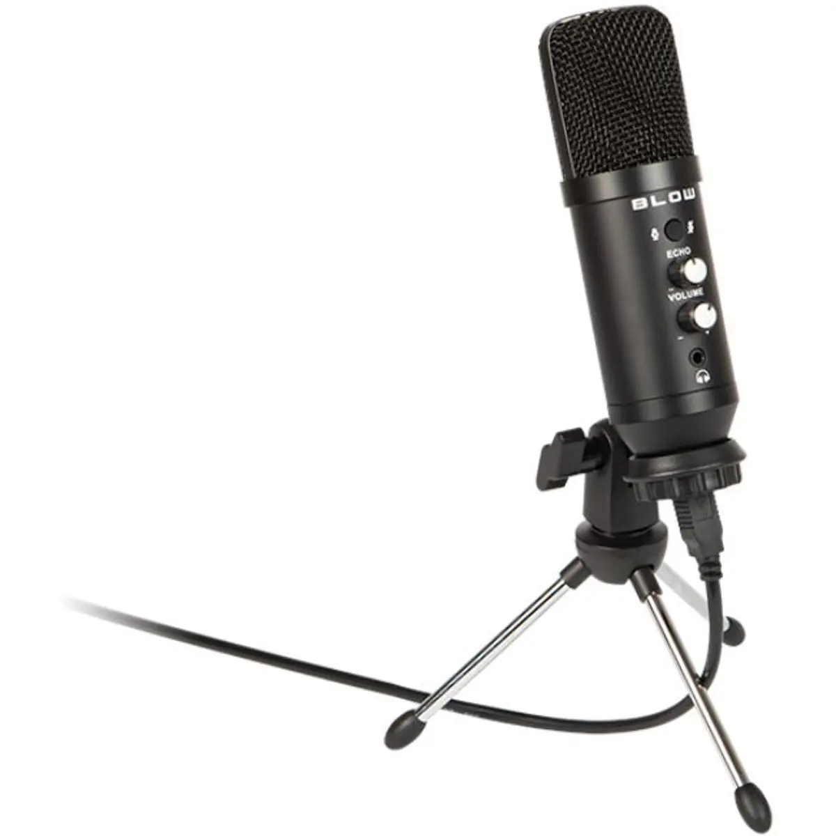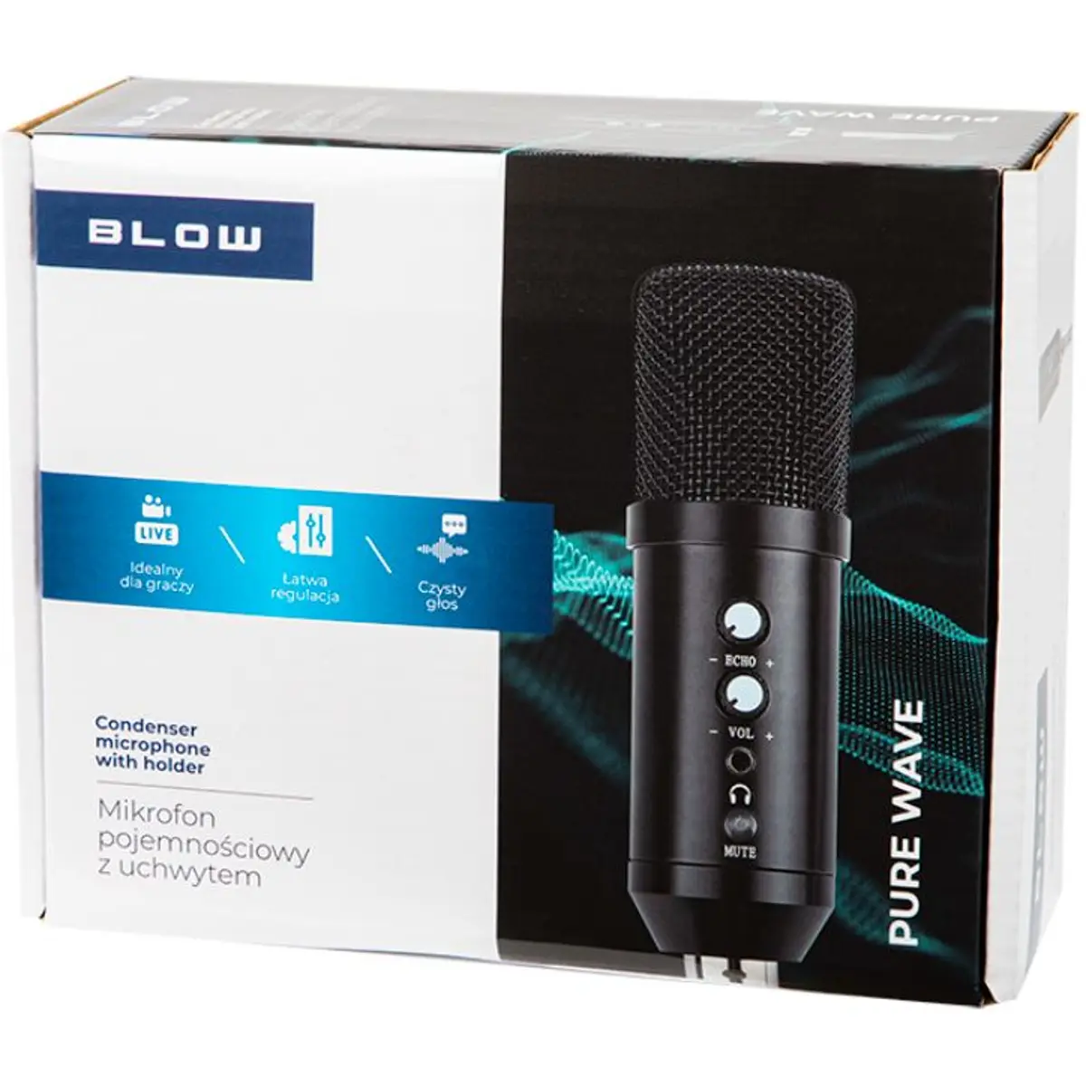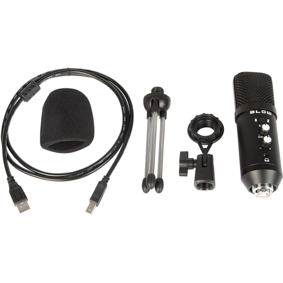 Microfone de estúdio BLOW de alta qualidade com acessórios completos, pronto para uso imediato. Graças à conexão via interface USB, o microfone é ideal para computadores ou notebooks para gravar vários tipos de sons, streaming ou outros fins.