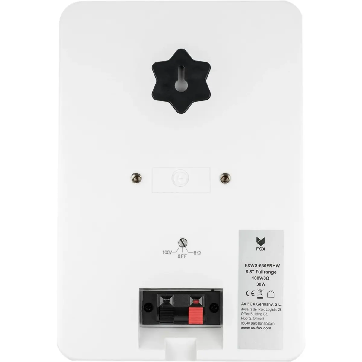 Coluna de parede com altifalante de 6.5 polegadas, 30W RMS e seletor de 100V/8Ω (para sistemas de linha de 100V ou normais de 8 Ohm). Concebido para reprodução de música de fundo, anúncios públicos e paging; em restaurantes, cafetarias, lobbies de hotéis, salas de conferências, cuidados de saúde, etc.